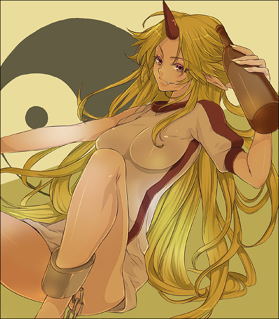 1girlalcoholblonde hairbottlebottomlesschainfangfemale focushornslong hairpointy earssakesingle hornskin tightsmilesolovery long hairyin yang