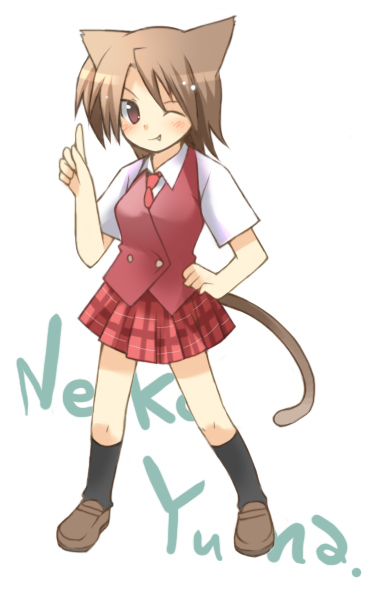 00s1girlanimal earsblushbrown eyesbrown haircat earscat tailfangfemale focushand on own hipone eye closedschool uniformshort hairsimple backgroundskirtsmilesolotailwhite background