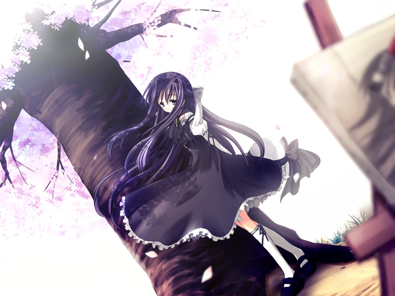 artoria pendragon (fate), saber (fate), fate/stay night, fate (series), commentary, highres, photo-referenced, symbol-only commentary, 1girl, :3, ahoge, blonde hair, blue bow, blue bowtie, blue skirt, blurry, blurry background, blush stickers, bow, bowtie, cake, cake slice, closed eyes, closed mouth, cup, dessert, eating, food, fork, holding, holding fork, notonaon, outdoors, shirt, sitting, skirt, solo, table, white shirt, wooden table