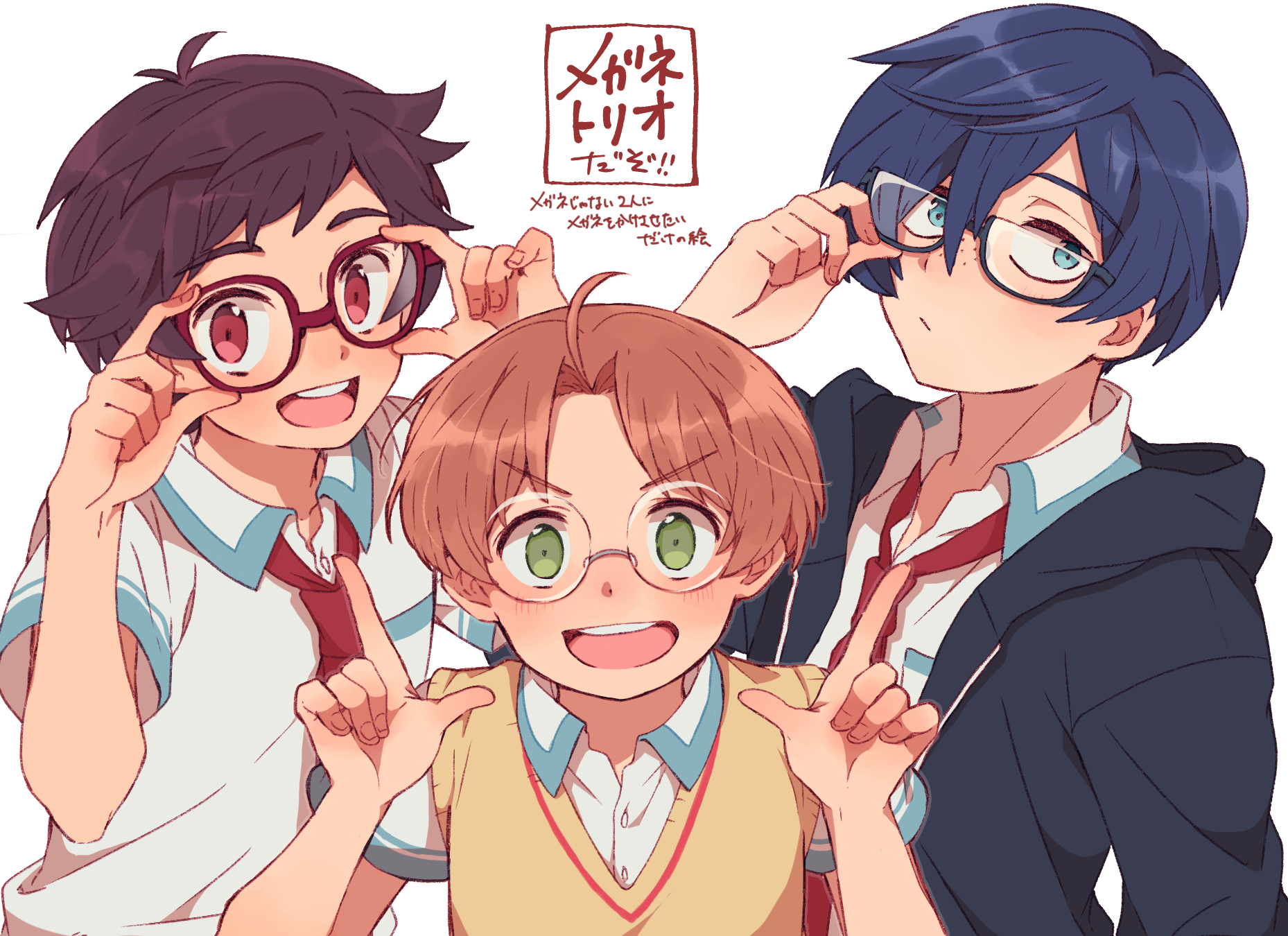3boysadjusting eyewearahogebespectacledblue eyesbrown hairbrown sweater vestcollared shirtfrecklesglassesgreen eyeshair between eyesindex finger raisedlooking at viewermale focusmultiple boysopen mouthrectangular eyewearred eyesred-framed eyewearshirtsimple backgroundsweater vestupper bodywhite backgroundwhite shirt