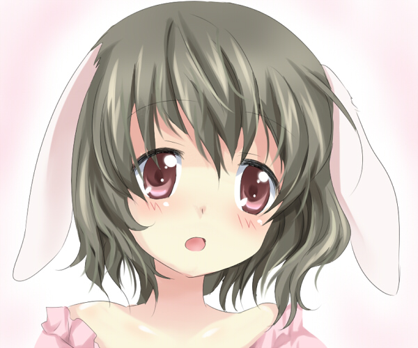 1girlanimal earsblushbrown hairfemale focusgradient backgroundopen mouthpink eyesportraitrabbit earsshort hairsolowavy hairwhite background