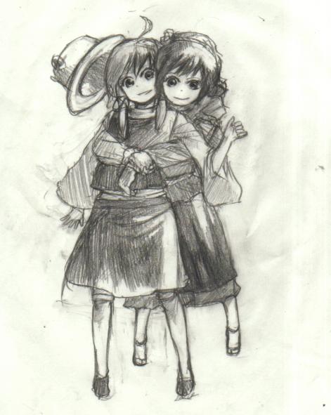 kasuga sunao, hakurei reimu, kirisame marisa, touhou, 2girls, :o, alternate color, apron, ascot, bare shoulders, black bow, black vest, blonde hair, blue eyes, blush, bow, detached sleeves, dress, female focus, frills, hair bow, hair tubes, hat, hat bow, long sleeves, looking at viewer, multiple girls, parted lips, red hair, ribbon-trimmed sleeves, ribbon trim, sarashi, smile, upper body, vest, waist apron, white dress, wide sleeves, witch hat