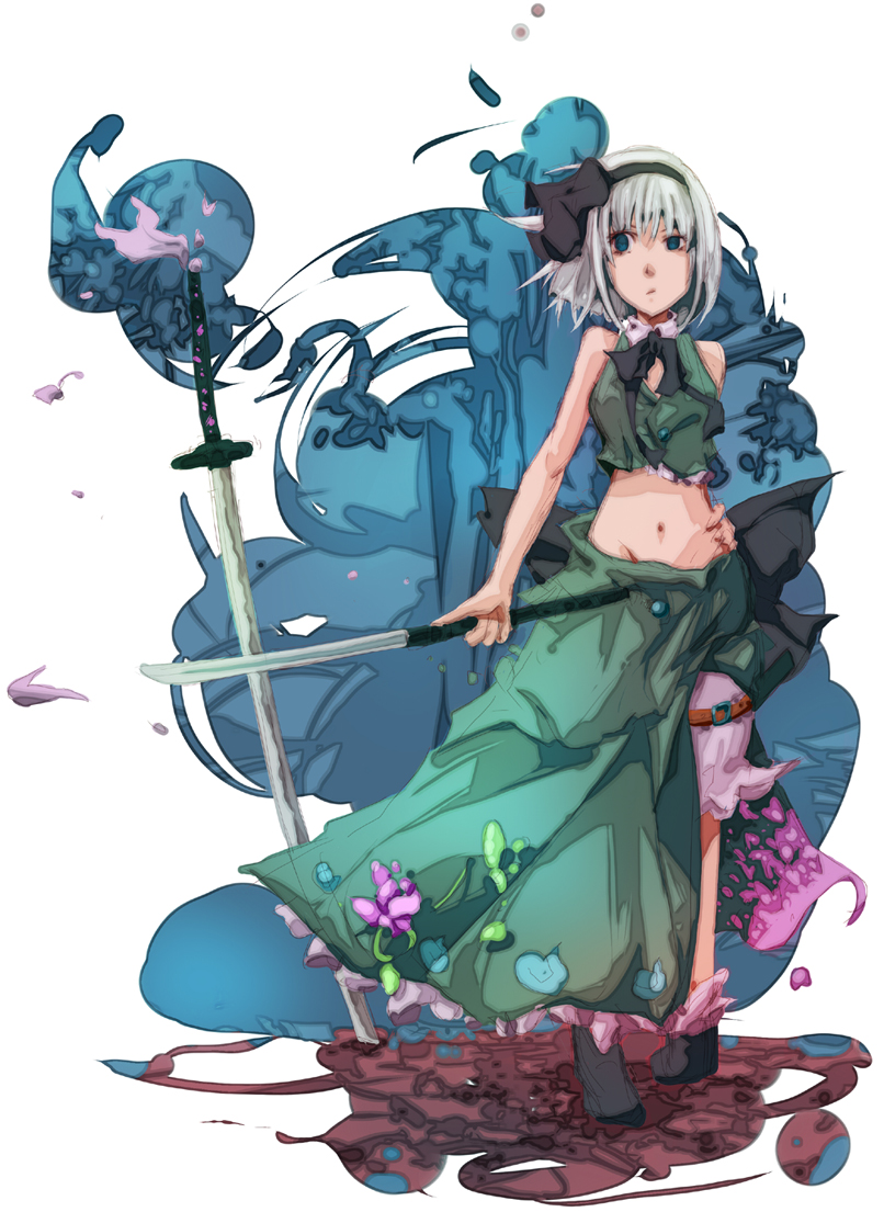ebora, louhi (fate), louhi (first ascension) (fate), fate/grand order, fate (series), absurdres, highres, 1girl, apron, bare shoulders, blue apron, blue dress, blue ribbon, blue shorts, blush, bow, breasts, buruma, collarbone, denim, denim shorts, dress, floral print, green buruma, green eyes, green hair, grey shirt, grin, hair between eyes, hair ribbon, horns, ladle, looking at viewer, multiple views, name tag, open mouth, ribbon, sharp teeth, shirt, short hair, short shorts, short sleeves, shorts, sidelocks, small breasts, smile, teeth, thighs, white shirt