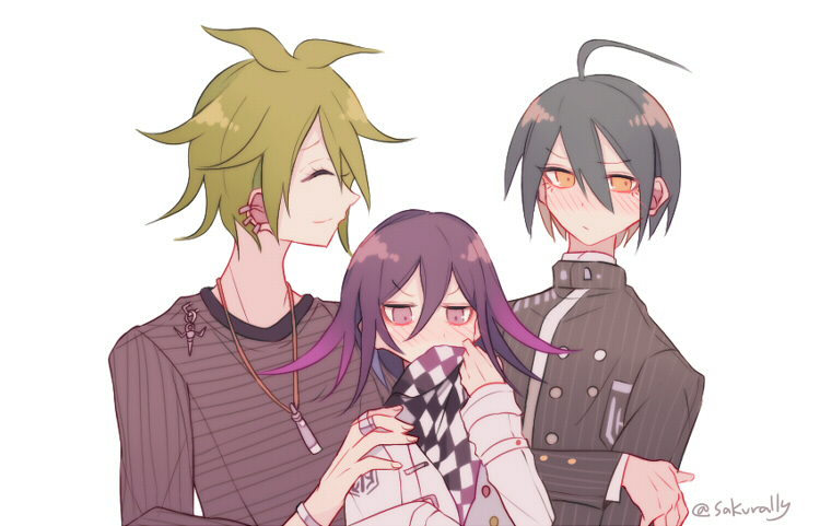 3boysadjusting scarfaegyo salahogeantenna hairbeltblack jacketblack scarfblushbreast pocketbroochbuttonscheckered clothescheckered scarfclosed mouthcollared jacketcovered mouthcrestdot nosedouble-breasteddownturned eyesear piercingembarrassedfingernailsfrownfurrowed browgreen hairgrey hairgrey shirthair between eyeshand on another's shoulderhappyhigh collarholding own armjacketjewelrylayered sleeveslong eyelasheslong sleeveslooking at anothermale focusmessy hairmulticolored buttonsmultiple boysmultiple piercingspendantpiercingpinstripe jacketpinstripe patternpocketpointy nosepurple eyespurple hairscarfshirtshort hairsimple backgroundsleeves past wristssmilestriped clothesstriped shirttwitter usernametwo-tone scarfundershirtupper bodyvertical-striped sleeveswhite backgroundwhite beltwhite jacketwhite scarfwrist beltyaoiyellow eyes