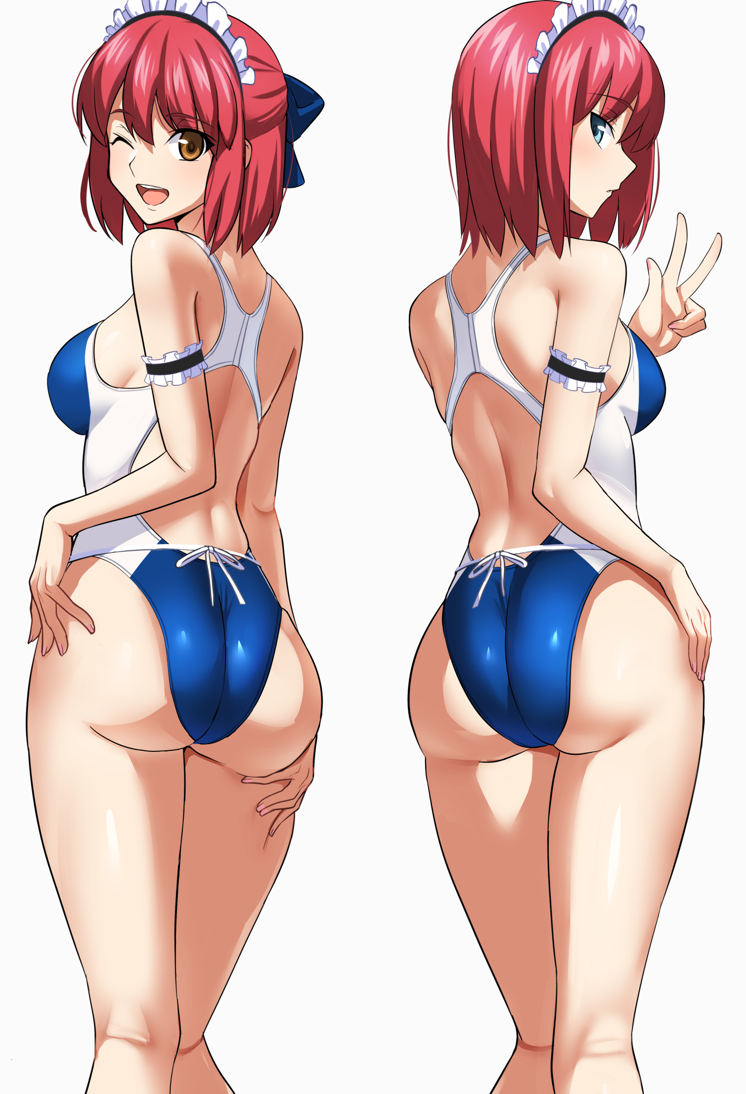2girlsapronassblue eyesblue one-piece swimsuitbowbreastsbrown eyesclosed mouthfrilled apronfrillshair bowhighleghighleg one-piece swimsuitlooking at viewerlooking backmaidmaid apronmaid headdressmultiple girlsmultiple viewsone eye closedone-piece swimsuitracerbackred hairshort hairsiblingssisterssmileswimsuittwo-tone one-piece swimsuitunconventional maidwhite background