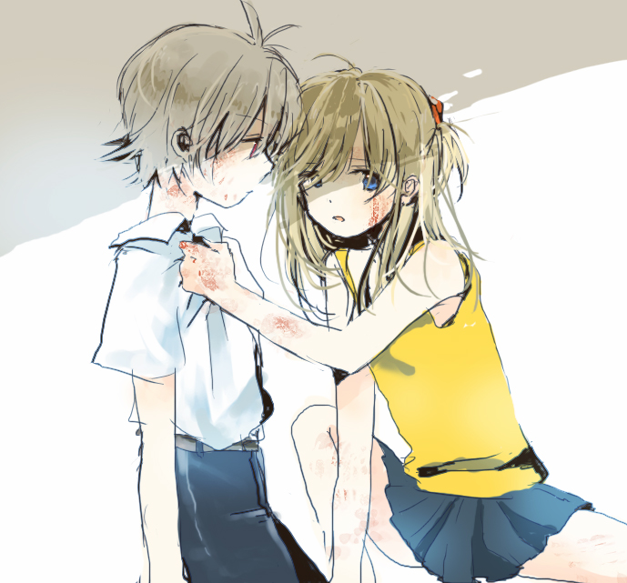 1boy1girlaged downalbinoalternate costumealternate hair colorantenna hairbare shouldersbeltblonde hairbloodblood on faceblood on handsblue eyesclothes grabhair ornamentlong hairlooking at anotherlooking at viewerpleated skirtred eyesshirtshirt grabsimple backgroundskirtsleevelessspread legstank topwhite background