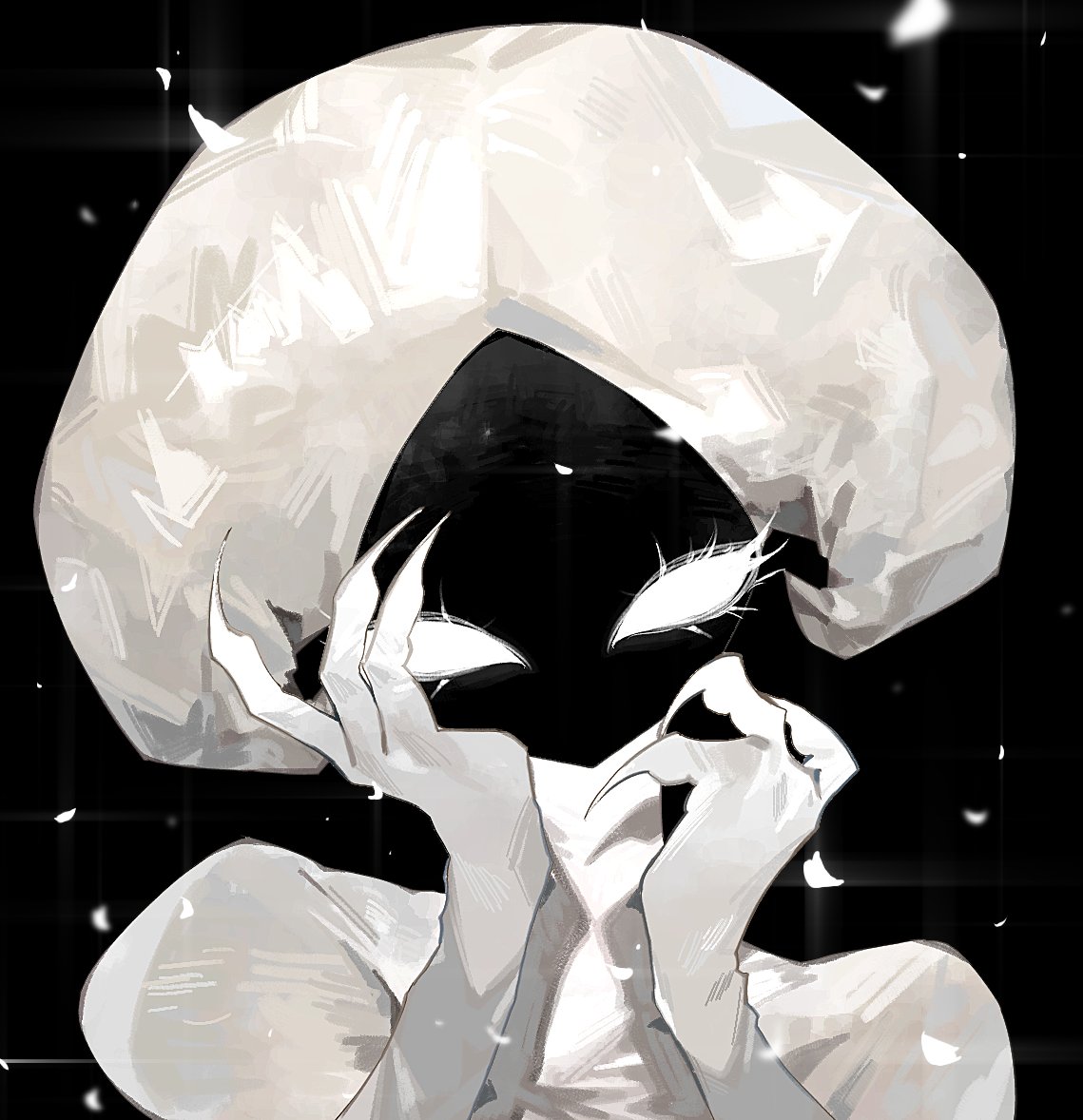 1girlarthropod girlblack skinblank eyesbodysuitclawscolored eyelashescolored skingloved sleeveshands on own cheekshands on own facehatjuliet sleeveslong sleevesportraitpuffy sleevessimple backgroundwhite bodysuitwhite eyeswhite hatwhite petalsyandere trance