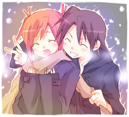 :d00s1boy2girlsandrogynousblack hairblushbreathbrown hairclosed eyesgrey backgroundgrinlong sleevesmultiple girlsopen mouthorange hairshort hairsimple backgroundsmilesnowingupper bodyyuri