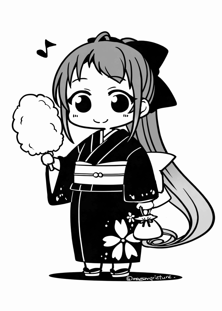 1girlalternate costumealternate hairstylebagbowchibicotton candyeighth notefloral printfull bodygreyscalehair bowjapanese clotheskimonomonochromemusical noteponytailsatchelsmilesoloyukata