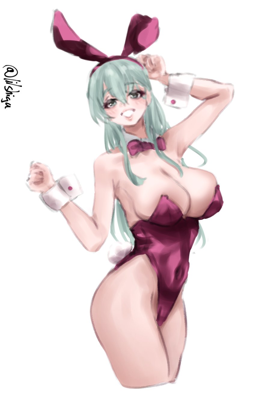 1girlalternate costumeanimal ear hairbandanimal earsbowbowtiebreastscleavagecropped legsdetached collarfake animal earsgreen eyesgreen hairgrinhairbandlarge breastsleotardone-hour drawing challengeplayboy bunnypurple bowpurple bowtiepurple leotardrabbit earsrabbit tailsimple backgroundsmilesolostraplessstrapless leotardtailtwitter usernamewhite backgroundwrist cuffs