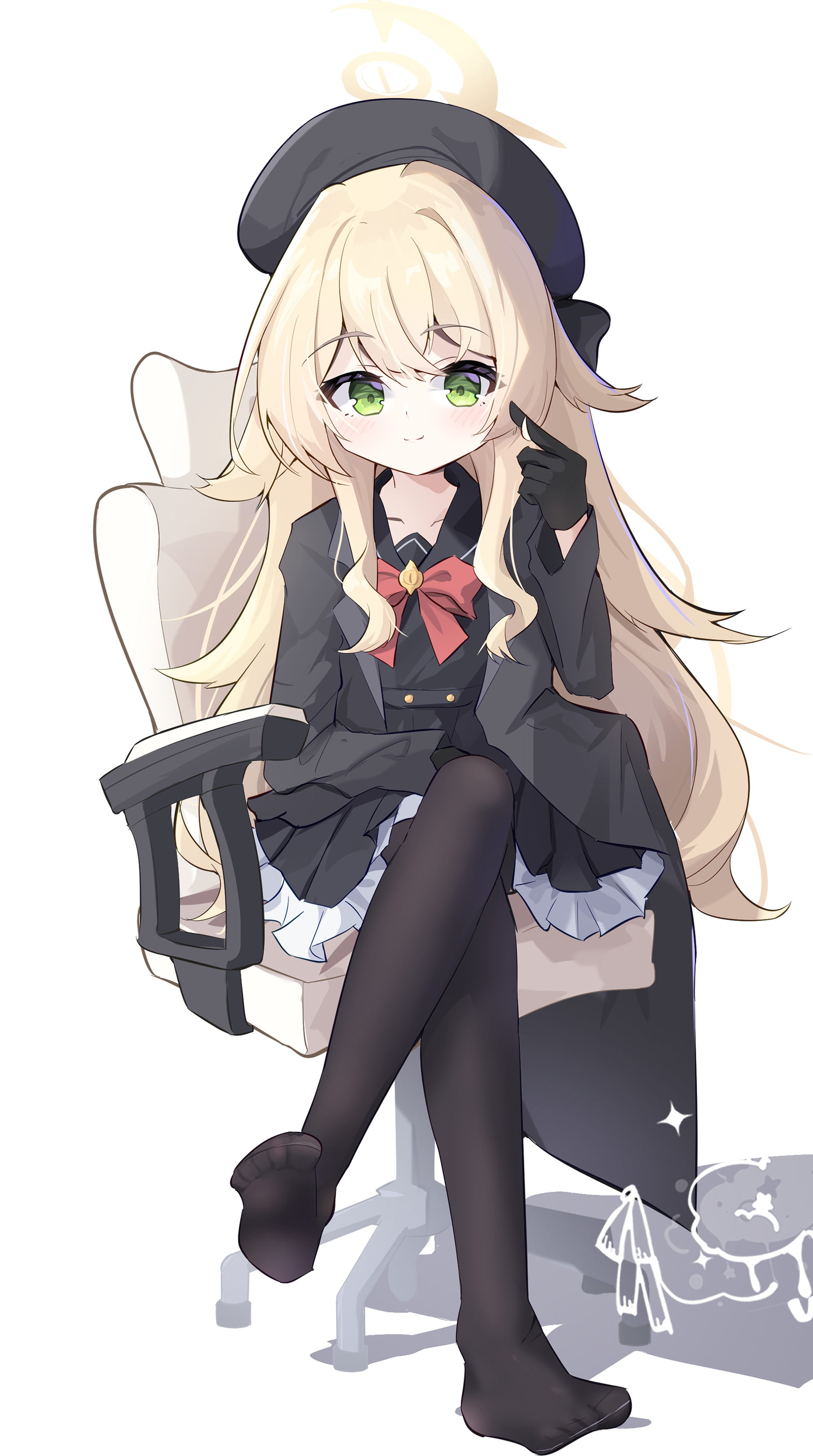 1girlblack glovesblack jacketblack pantyhoseblack skirtblack sleevesblonde hairbowchaircollarbonecrossed bangscrossed legsfeetflat chestfrilled skirtfrillsfull bodyglovesgreen eyeshair between eyeshair over shoulderhalohatindex finger raisedjacketlong coatlong hairlong sleeveslooking at vieweroffice chairopen clothesopen jacketpantyhosered bowshadowsimple backgroundsittingskirtsmilesoloswivel chairtoestwirling hairwhite backgroundyellow halo