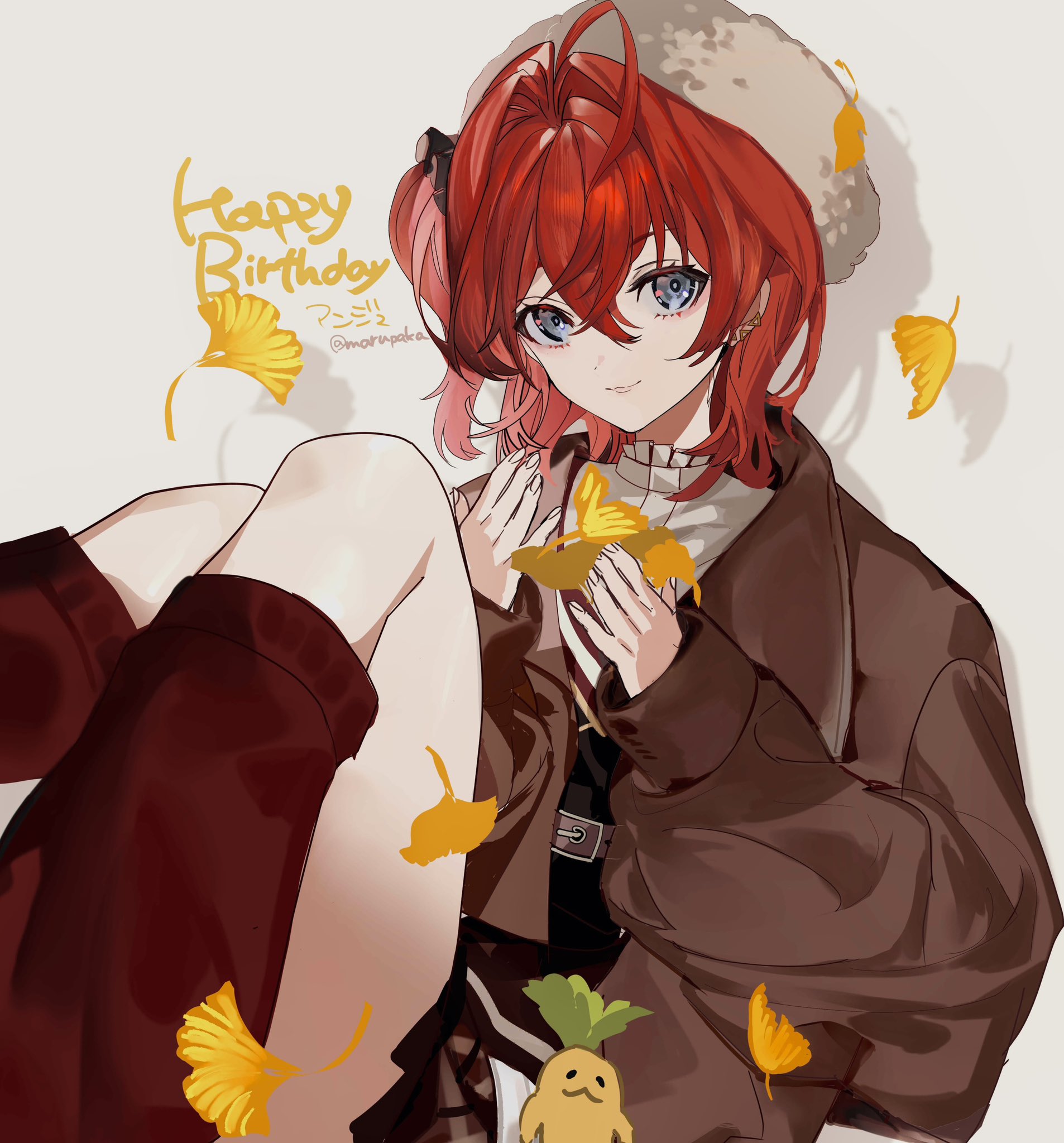 1girlahogealternate costumeautumn leavesbaggy clothesblack vestbrown coatbrown hatbrown skirtbrown sockscharacter nameclosed mouthcoatcrossed bangsdrop shadowenglish texteyeshadowfalling leavesfur hatgrey backgroundgrey eyesgrey shirthair between eyeshair intakeshands uphappy birthdayhatholdingholding leafkneehighsknees upleaflong bangslooking at viewermakeupmedium hairminiskirtmixed-language textmultiple piercingsopen clothesopen coatpink eyeshadowred hairshirtside ponytailsittingskirtsleeves past wristssmilesockstwitter usernamevestvirtual youtuber