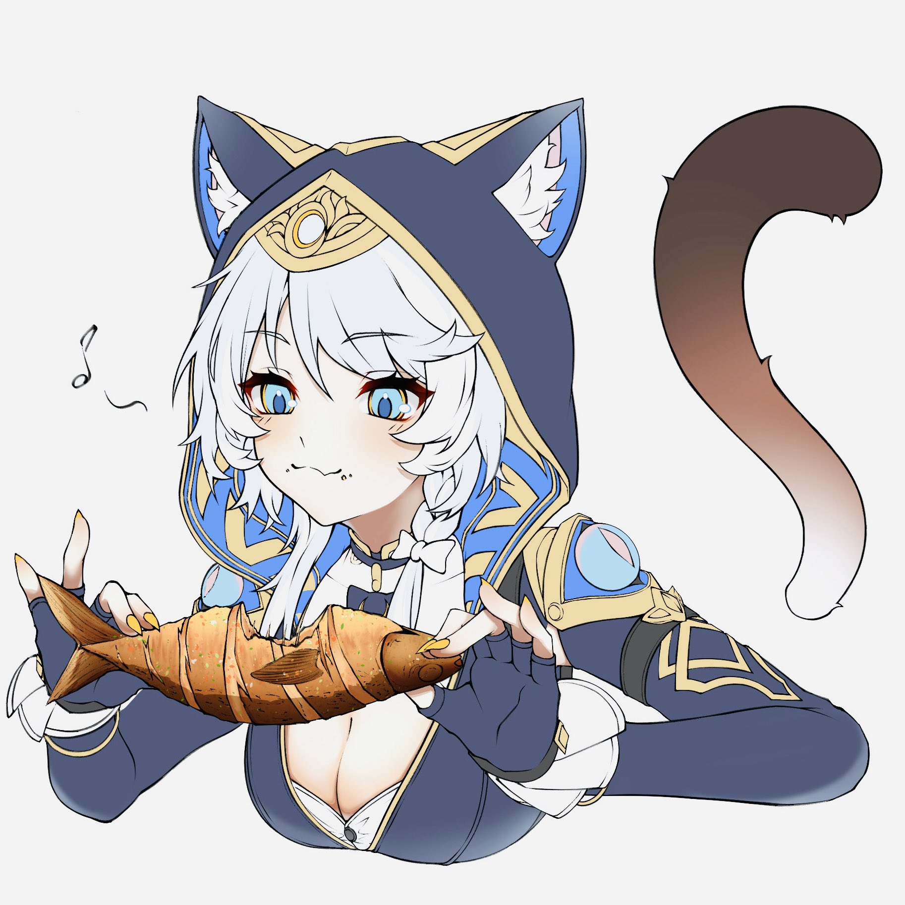 1girlanimal ear fluffanimal earsanimal hoodblack glovesblue eyesblue pupilsbreastscat earscat hoodcat tailcleavageclosed mouthcropped torsocrumbseatingfangfingerless glovesfish (food)foodgloveshands upholdingholding foodhoodlarge breastsmusical notesimple backgroundskin fangsolospoken musical notetailupper bodywhite backgroundwhite hairyellow nails