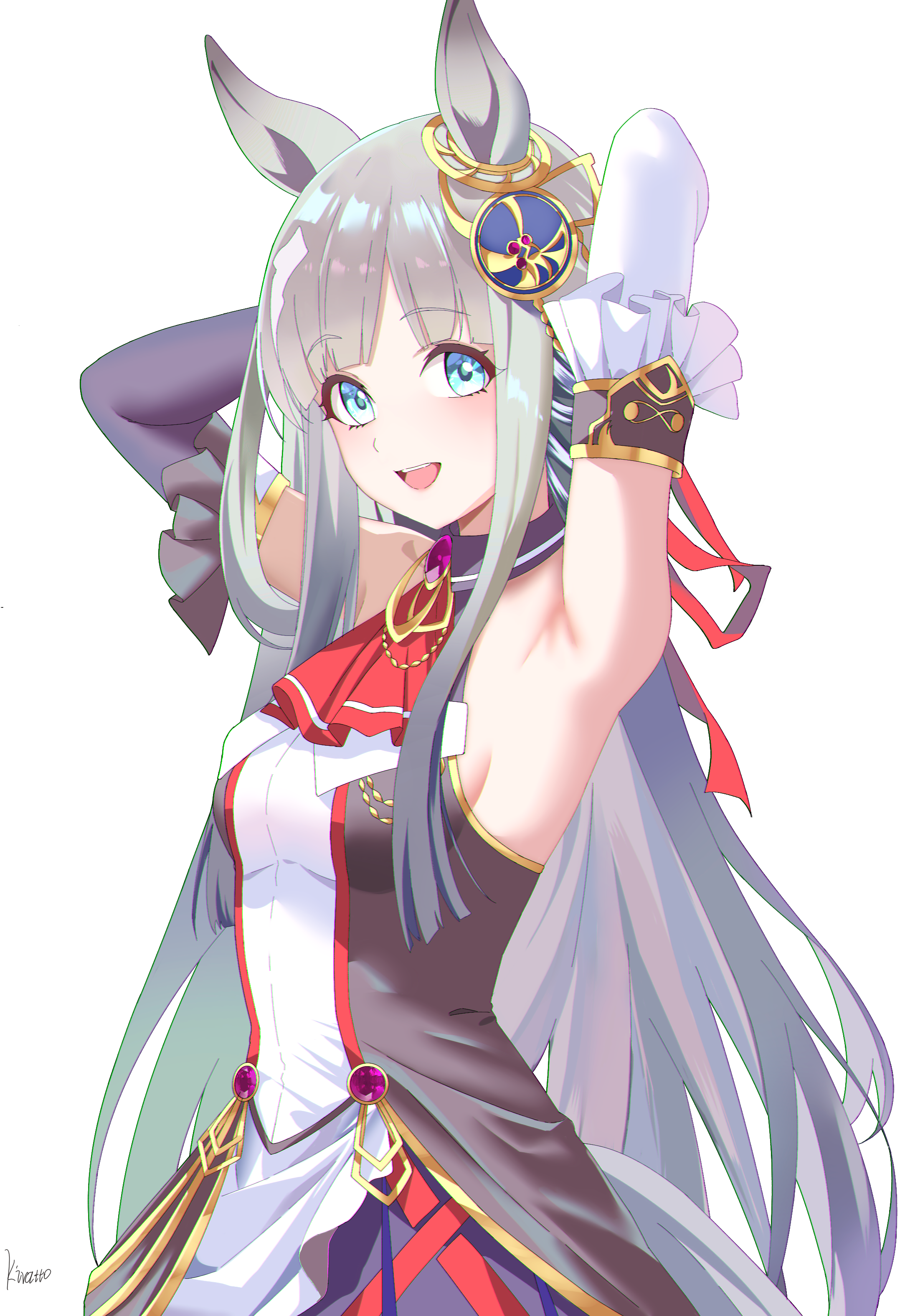1girlanimal earsarms behind headarms upblack glovesblue eyesblushbreastsdressear ornamentelbow glovesglovesgrey hairhorse earshorse girlhorse taillong hairlooking at viewermedium breastsmulticolored dressopen mouthsimple backgroundsmilesolotailteethupper teeth onlywhite backgroundwhite gloveswhite streaks