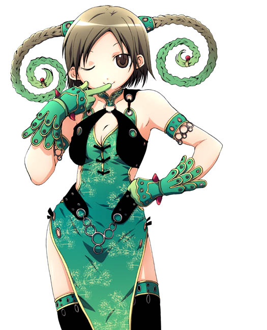 1girlanimificationbraidbreastscleavagedressfemale focusglovesone eye closedsolothighhighstwin braidswink