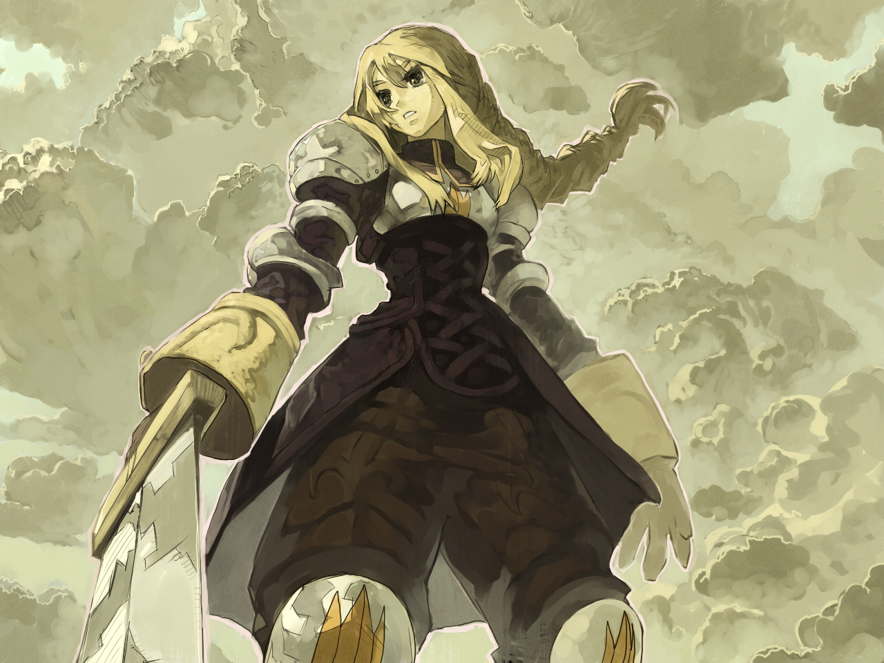 1girlarmorblonde hairbraidbraided ponytailfemale focuslong hairoutdoorssingle braidskysoloswordweaponyellow eyes