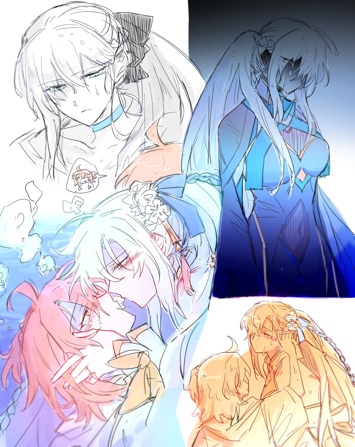 takase kanan, asakura ryoko, nagato yuki, suzumiya haruhi no yuuutsu, 00s, 2girls, arms behind back, blue hair, blue skirt, blush, half updo, long hair, long sleeves, looking at viewer, multiple girls, purple hair, school uniform, serafuku, shirt, simple background, skirt, very long hair, white background, white shirt, yellow eyes