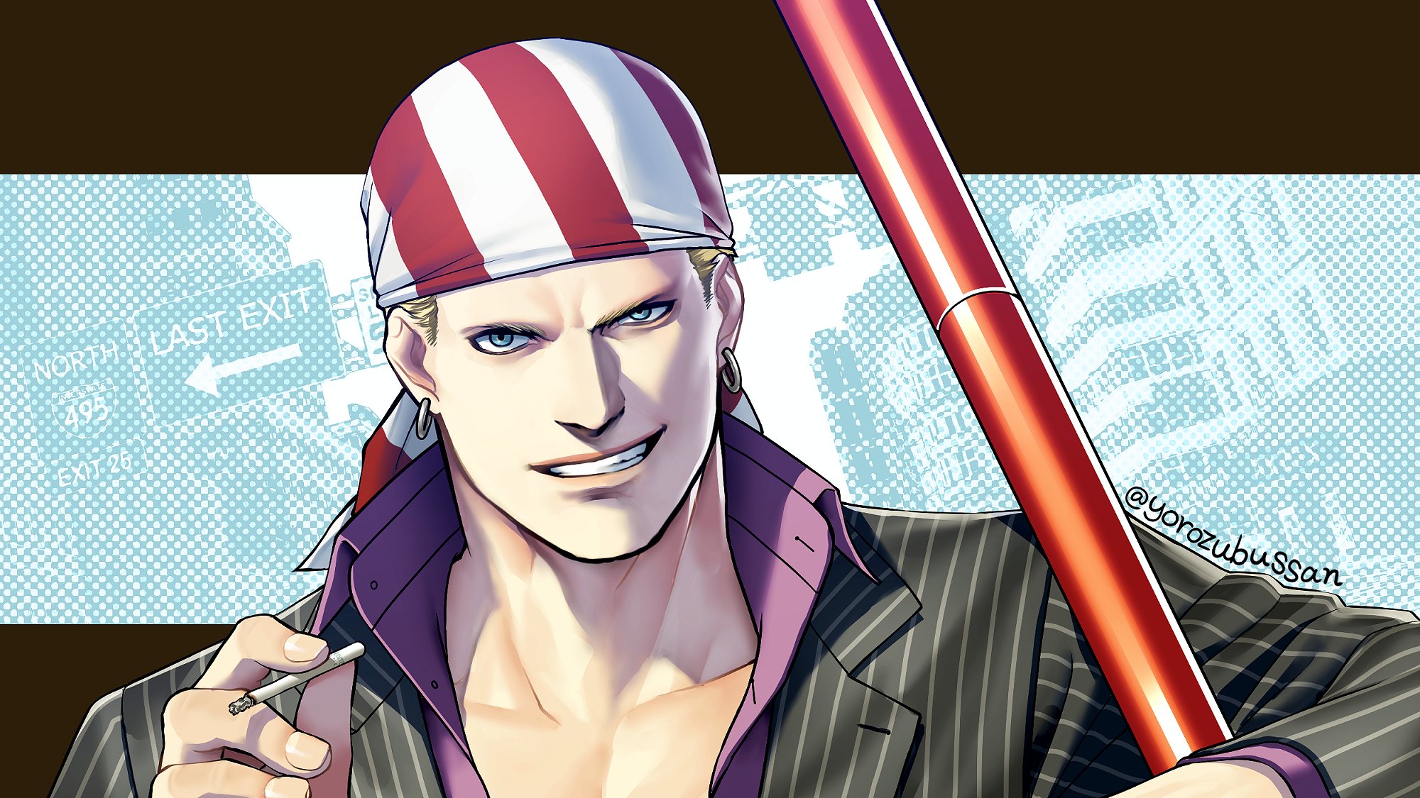 1boyblack suitblonde hairblue eyesbo staffcigarettecollarboneearringsformal clothesgrinhalftoneholdingholding cigarettejewelryletterboxedlooking at viewermale focuspurple shirtshirtshort hairsmilesolostriped bandanastriped suitsuit