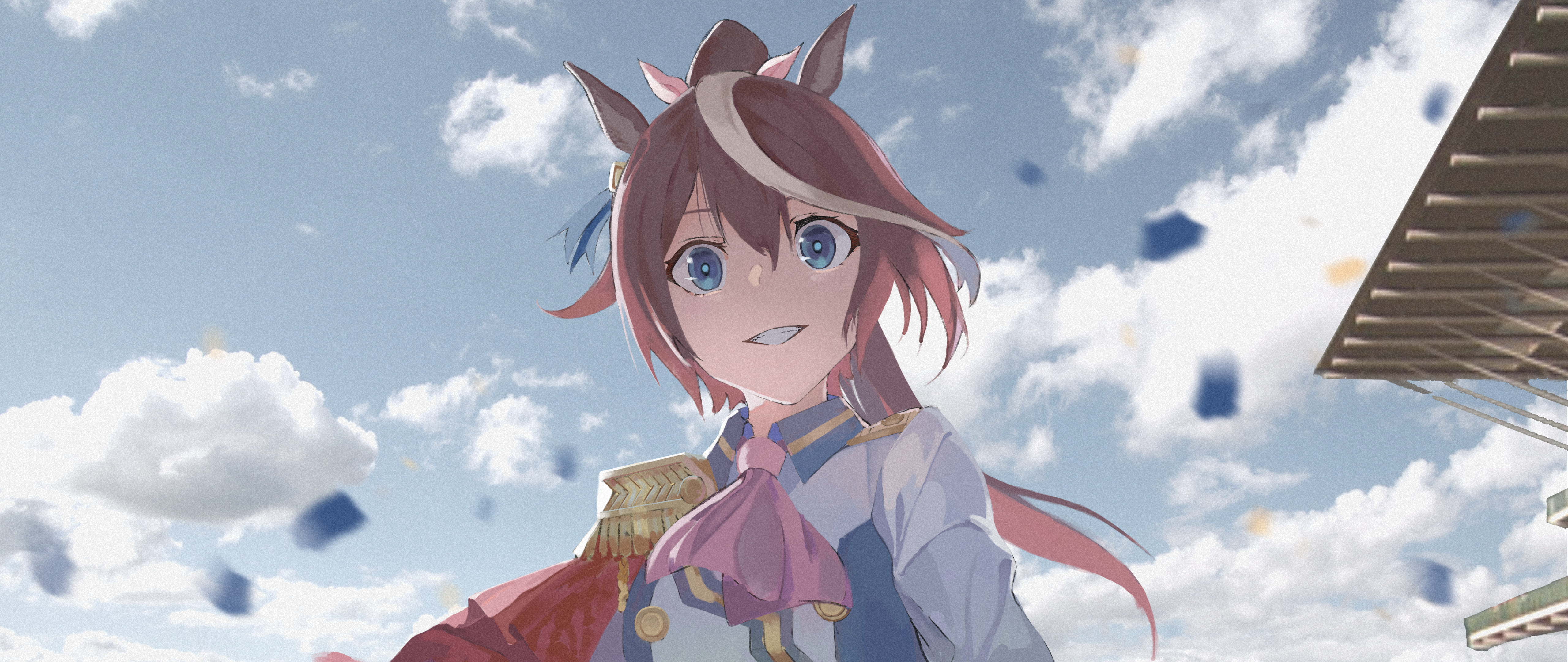 1girlanimal earsblue eyesblue skybowbrown hairbuttonscapeletcloudcollared shirtconfettidaydouble-parted bangsear ornamentepaulettesgrinhair between eyeshair bowhorse earshorse girllong hairlooking at viewermulticolored hairoutdoorspink bowponytailred capeletshirtsingle epauletteskysmilesolostreaked hairupper bodywhite hairwhite shirt