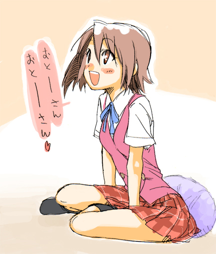 00sblushbrown eyesbrown hairopen mouthplaid clothesplaid skirtschool uniformshort hairside ponytailsittingskirtsolo