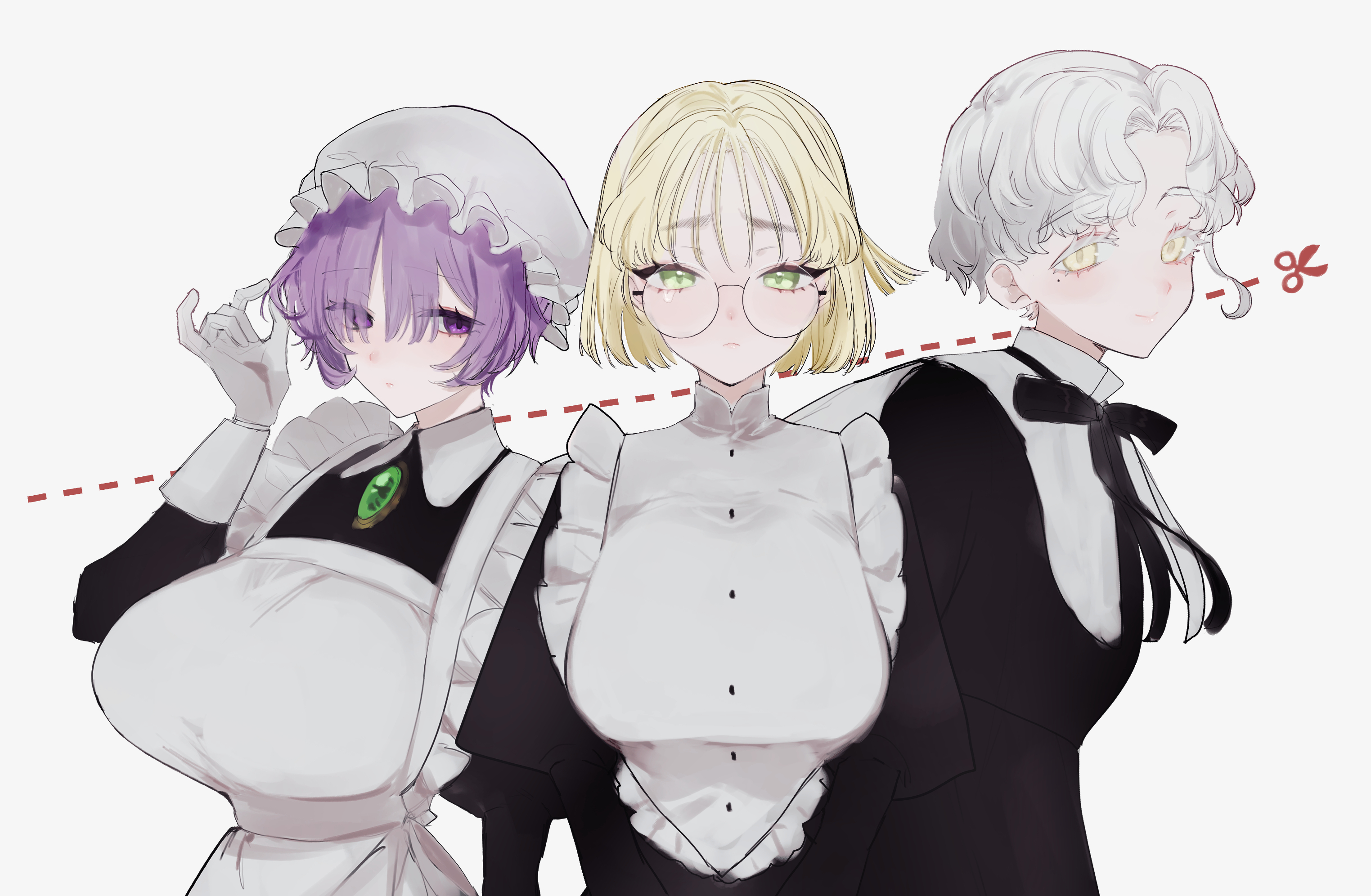 gagaga, behemoth (nikke), leviathan (nikke), ziz (nikke), goddess of victory: nikke, 3girls, ?, bare shoulders, black background, black gloves, black nails, claw pose, confused, ear piercing, evil smile, fang, fingerless gloves, gloves, hair over one eye, horns, multiple girls, open mouth, piercing, side ponytail, simple background, single horn, slit pupils, smile, spoken question mark, teeth, tongue, tongue out, tongue piercing, upper body, white background