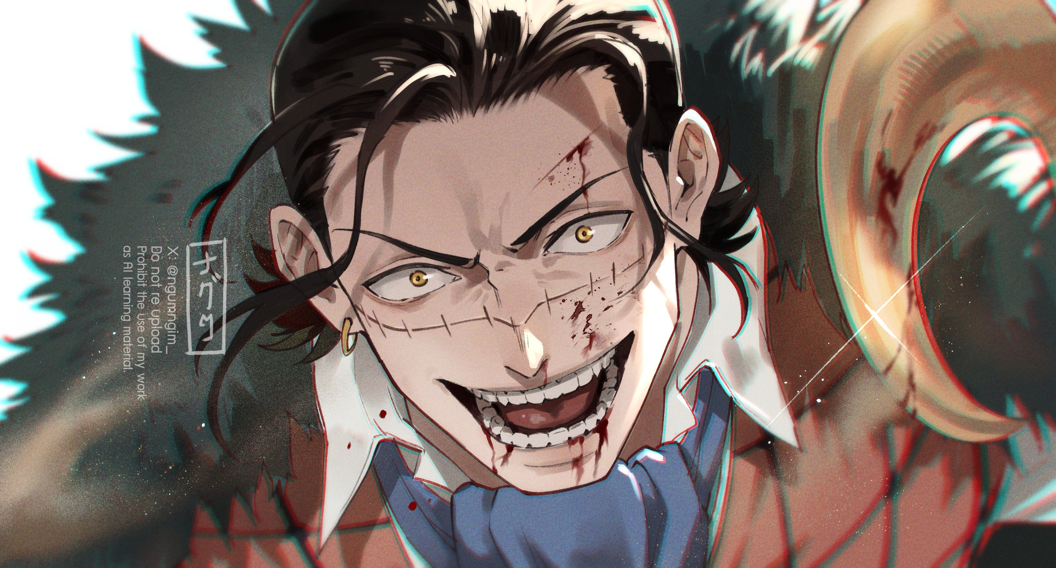 1boyascotblack hairbloodblood on faceblue ascotbrown vestcoatearringsfur trimfur-trimmed coatglinthook handjewelrylooking at viewermale focusmature maleopen mouthrealistic teethsignaturesolostitched facestitchesvestwide-eyedyellow eyes