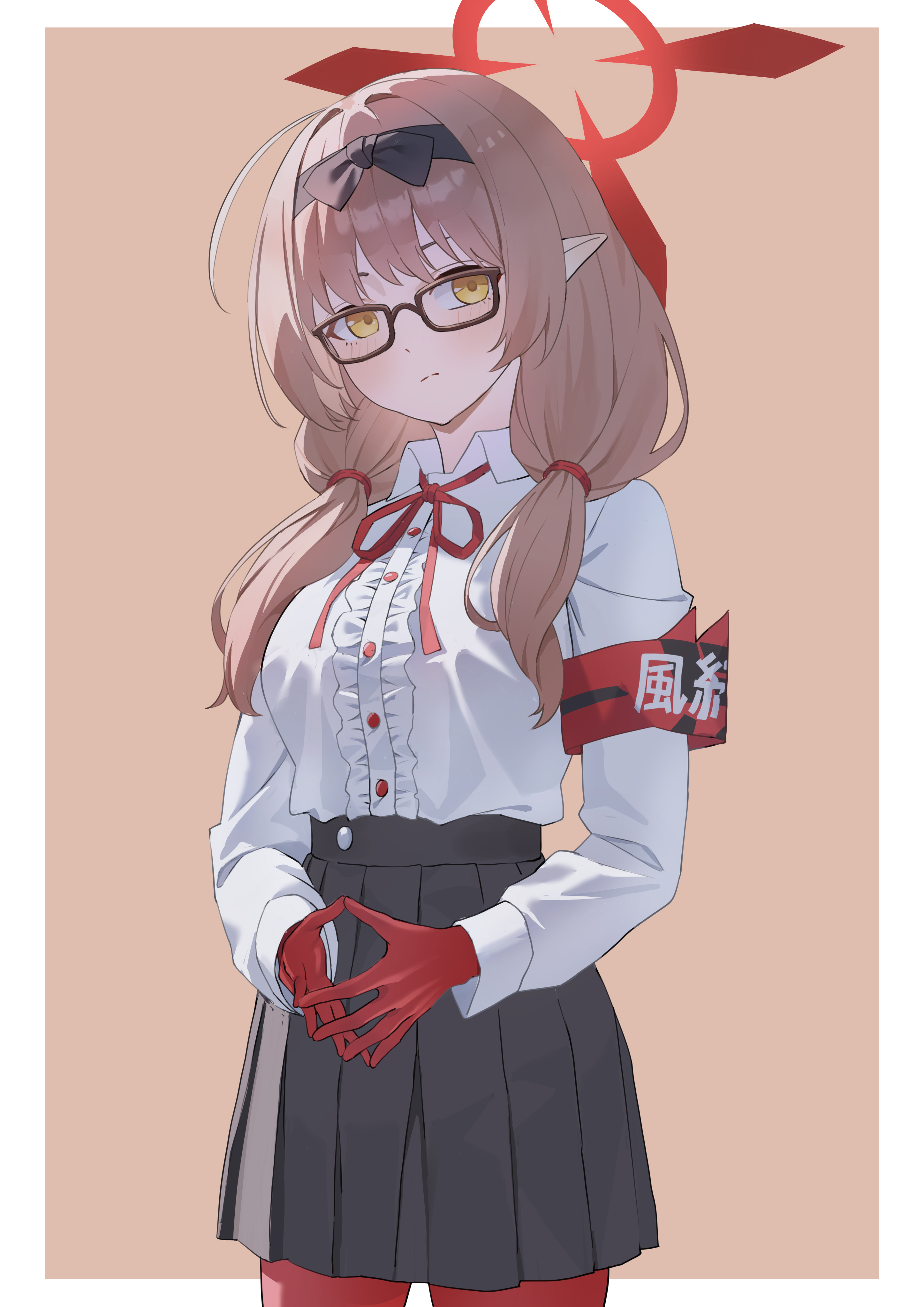 1girlarmbandblack hairbandblack skirtborderbrown backgroundbrown hairbrown-framed eyewearcenter frillsclosed mouthcollared shirtcowboy shotexpressionlessfrillsglassesgloveshairbandhalolong hairlooking at viewerlow twintailsminiskirtneck ribbonpantyhosepleated skirtpointy earsrectangular eyewearred armbandred glovesred halored pantyhosered ribbonribbonshirtsimple backgroundskirtsolosteepled fingerstwintailswhite borderwhite shirtyellow eyes