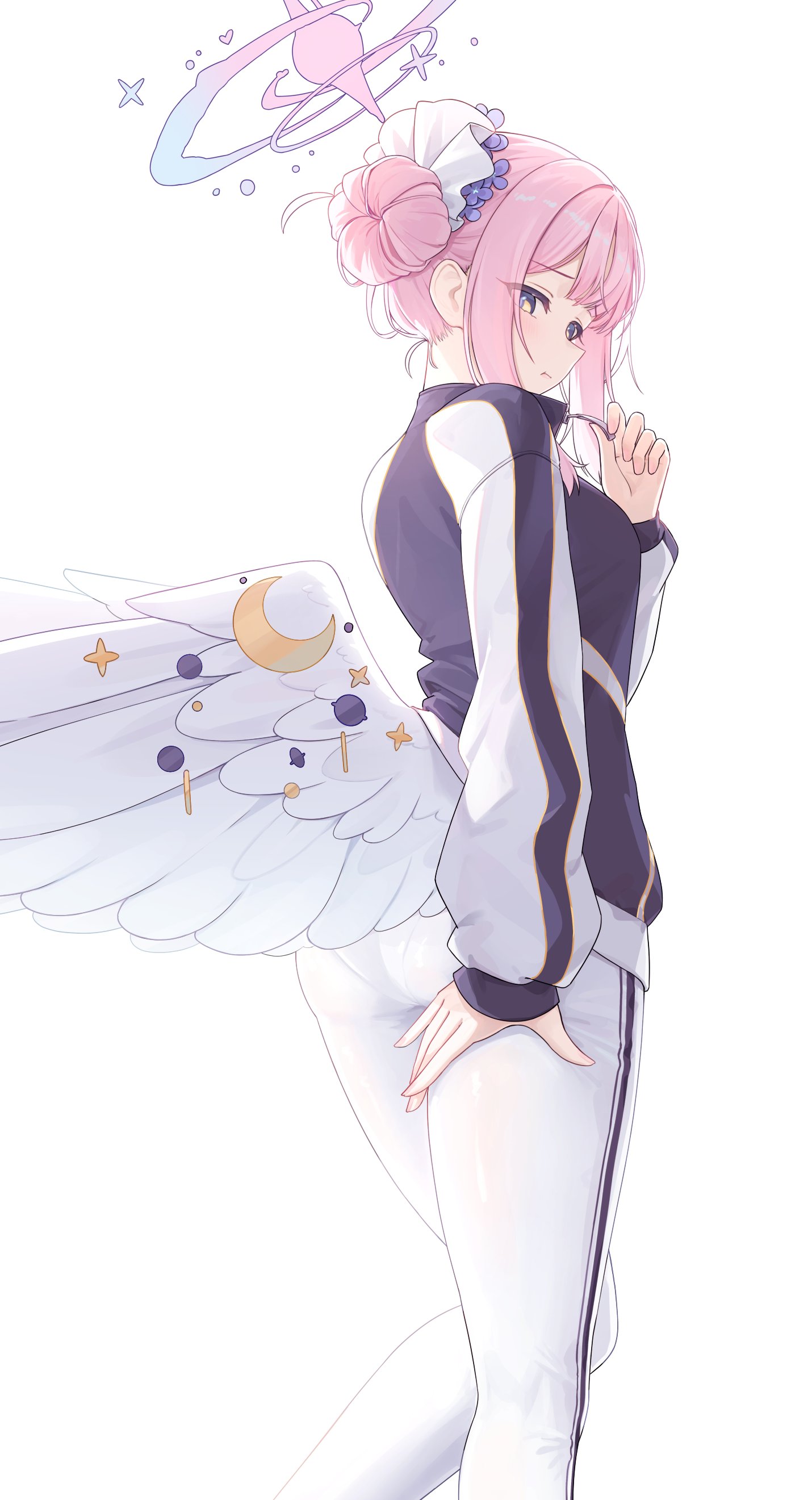 1girlalternate costumealternate hairstyleassblack jacketblushclosed mouthdouble bunfeathered wingshair bunhair ornamenthand upjacketlong sleeveslow wingsmulticolored jacketpantspantylinespink hairpoutpuffy long sleevespuffy sleevessimple backgroundsolotrack jacketwhite backgroundwhite pantswhite wingswingsyellow eyes