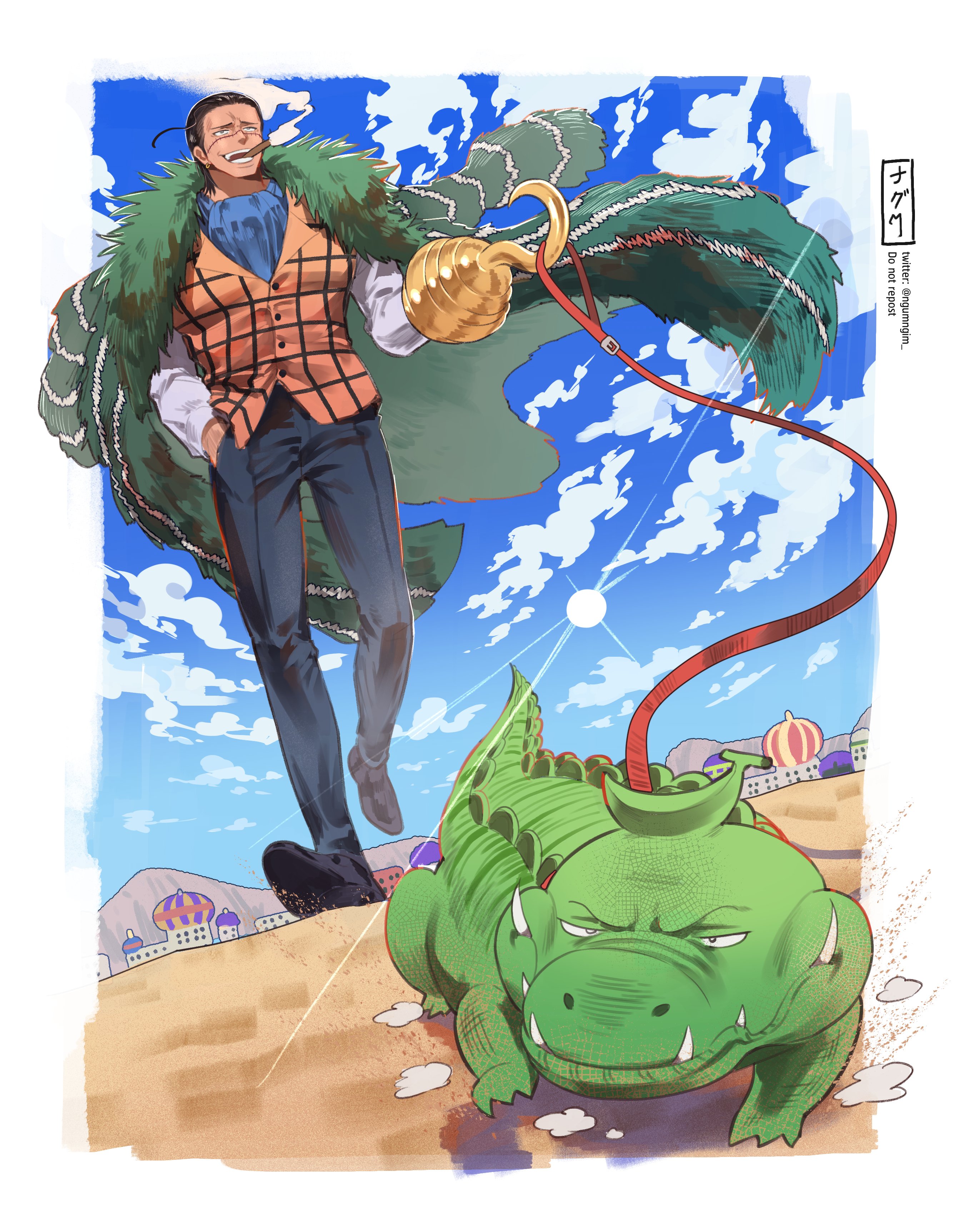 1boyalligatoranimalascotblack hairblack pantsblue ascotbordercigarcoatcoat on shoulderscrocodilianfrom belowfull bodygreen coathair slicked backhand in pockethook handmale focusmature maleorange vestpantspet walkingshort hairsunvestwalkingwhite border