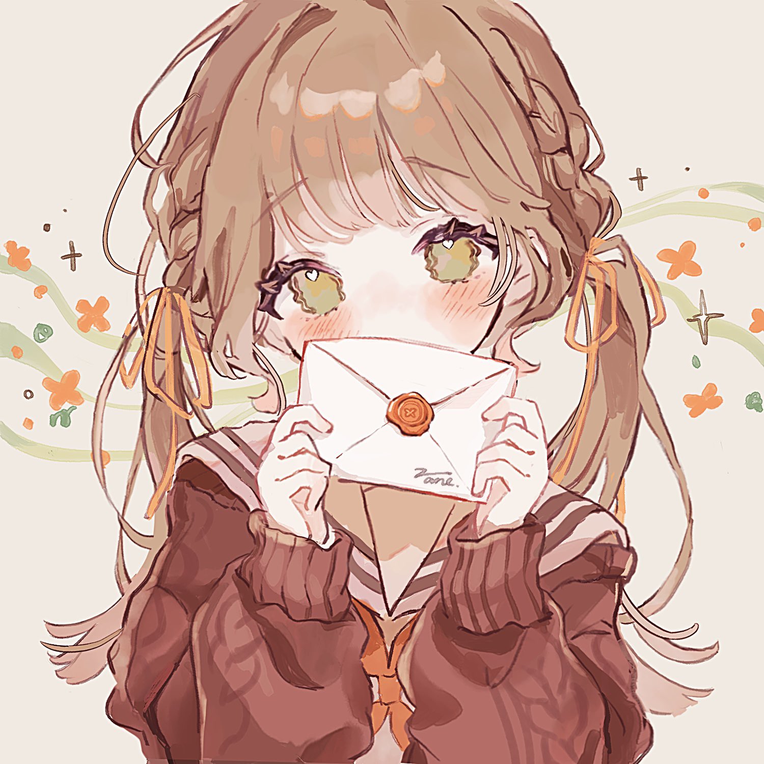 1girlartist nameblushbraidbrown hairbrown sweatercardigancovering own mouthenvelopeeyelashesflowergreen eyeshair ribbonholdingholding envelopeholding letterletterlong hairlong sleeveslooking at viewerlove letterneckerchieforange flowerorange neckerchieforange ribbonribbonsailor collarschool uniformserafukushirtsignaturesolosweatertwintailsupper bodywhite sailor collar