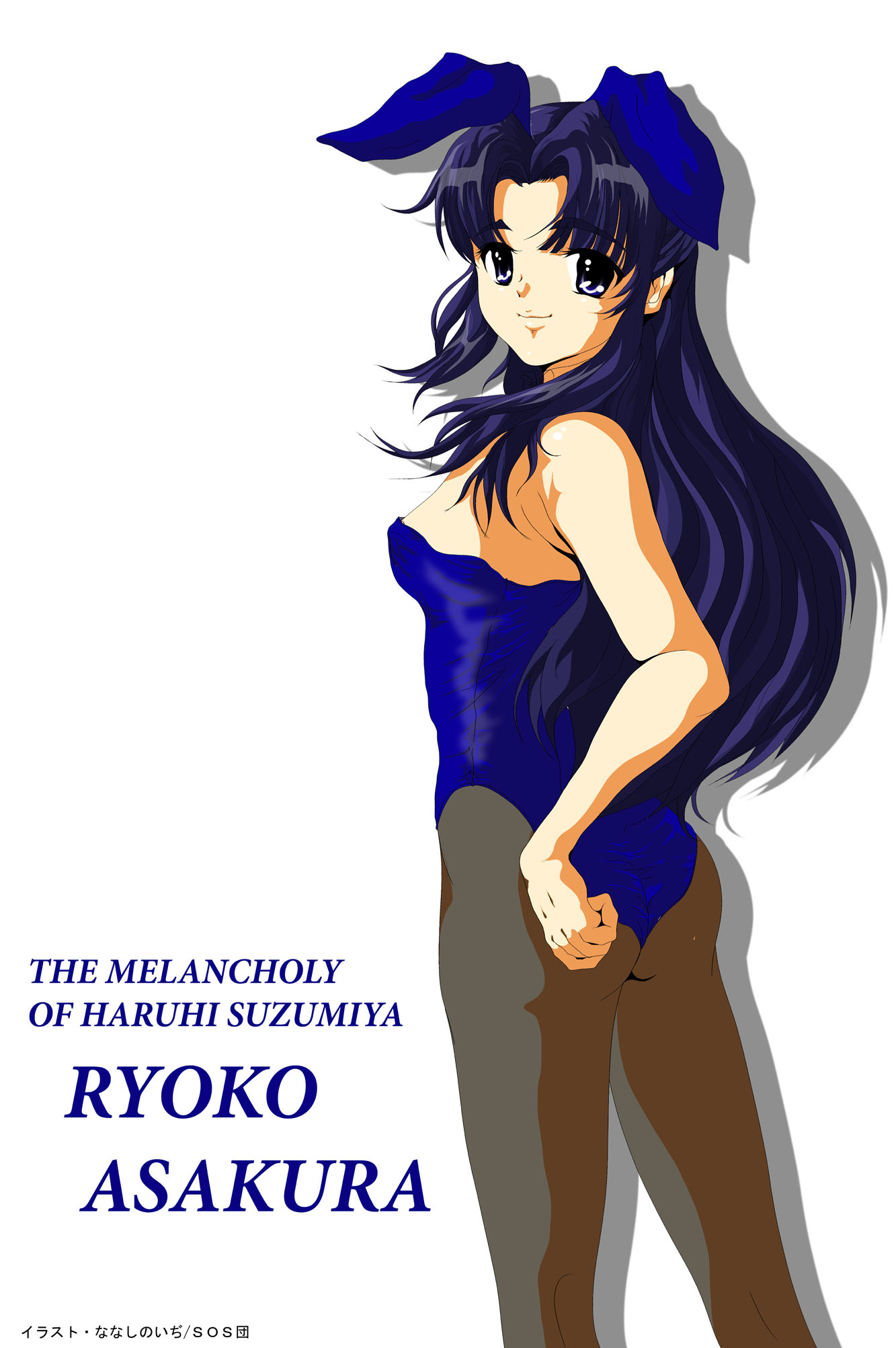 00sanimal earsblue eyesblue hairbrown pantyhosecharacter namecopyright namecowboy shotfake animal earsfrom sidekneepitslegs apartlong hairlooking backpantyhoseparted bangsplayboy bunnyrabbit earssimple backgroundsolostandingthick eyebrowswhite background