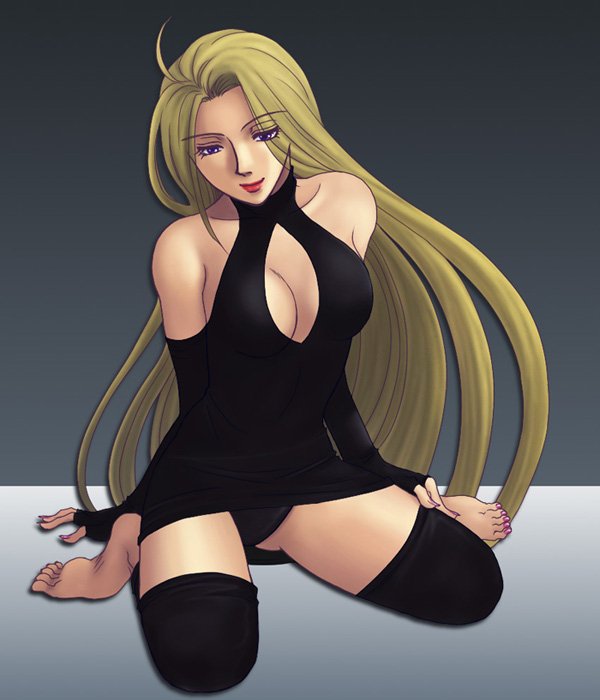 1990s (style)1girlbad anatomybad feetbarefootblack dressblack leggingsblonde hairbreastsdressfeetfemale focusfull bodyleggingslong hairpantiespoorly drawnpurple eyesretro artstylesolounderwearvery long hair