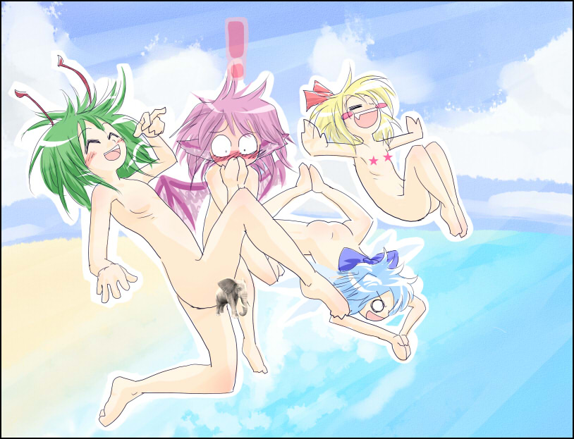 1boy4girlsandrogynousantennaebarefootblonde hairblue hairblushblush stickersbowcensoredclosed eyescovering facecovering own mouthcovering privatesdivedivingelephantgenderswapgenderswap (ftm)green hairhair bowicejumpinglegslolilupin divemultiple girlsno nipplesnovelty censornudenude coveroutstretched armspink hairspread armsstar (symbol)team 9 (touhou)thighs