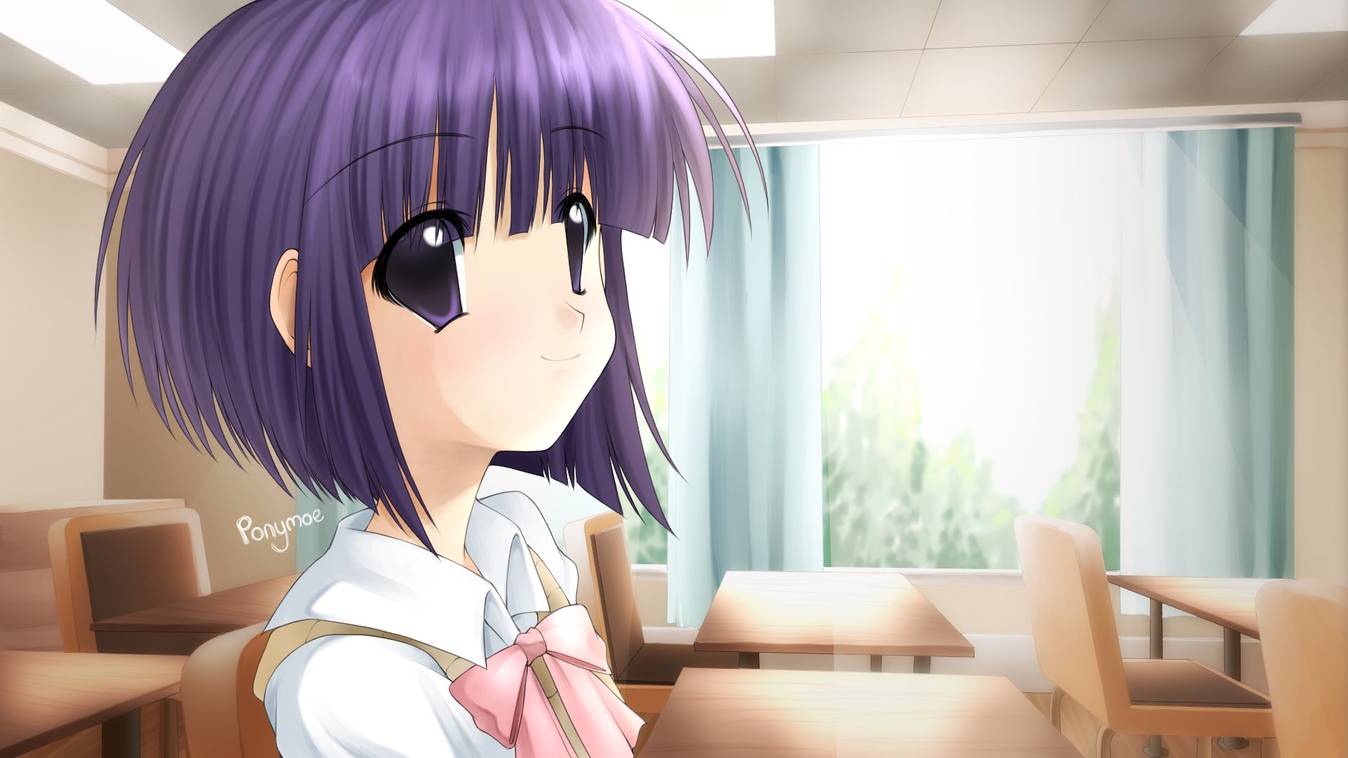 1girl2000s (style)blunt bangsblunt endsbob cutbowcollared shirtdeskfaux retro artstylepurple eyespurple hairschool uniformshirtshort hairsmilesweater vesttabitha (tabitha)tareme