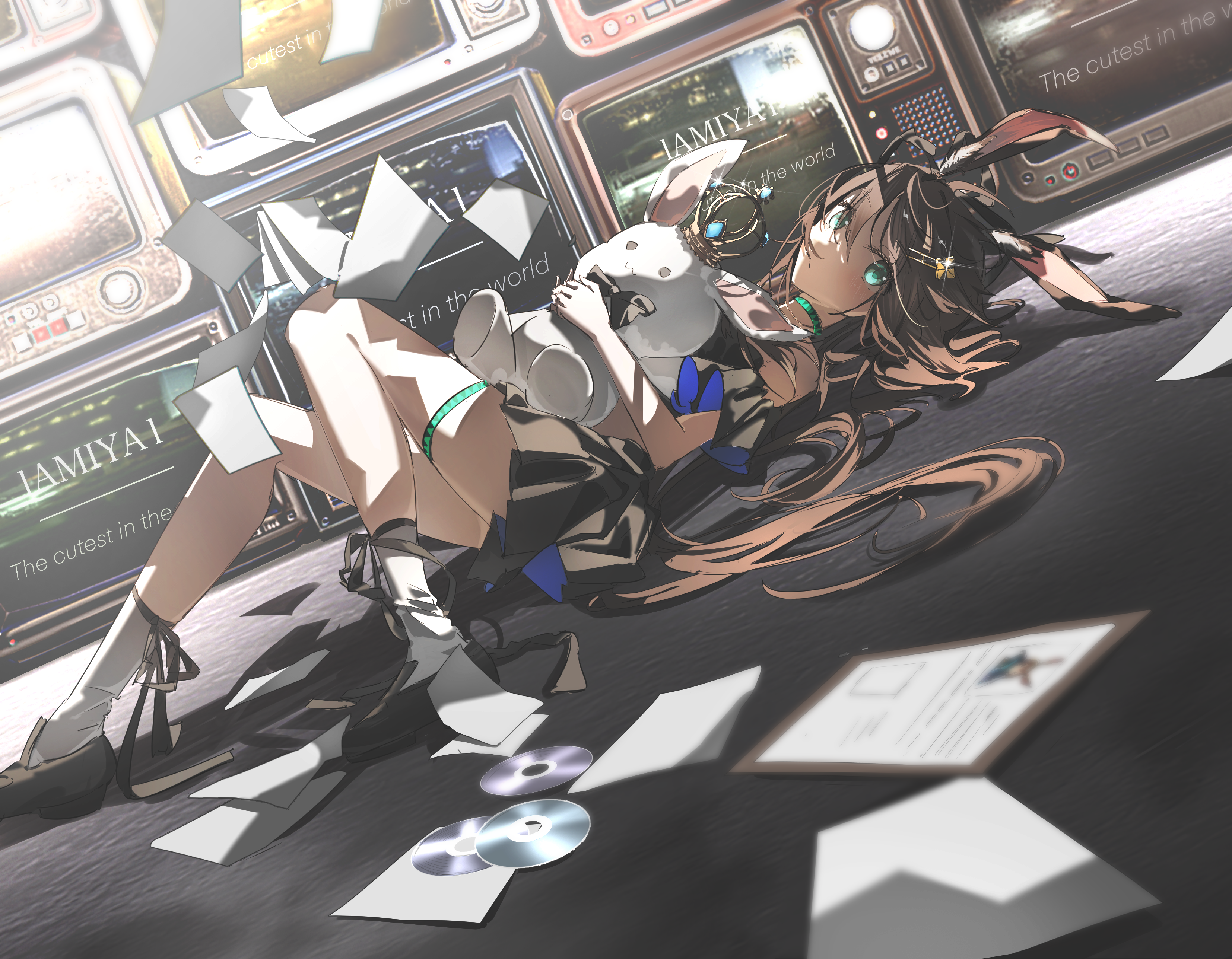 1girlanimal ear fluffanimal earsblack dressblack shoesblushbrown hairdressglovesgreen eyeshair between eyesholdingholding stuffed toylong hairlyingon backrabbit earsrabbit girlshoessockssolostuffed animalstuffed rabbitstuffed toywhite gloveswhite socks