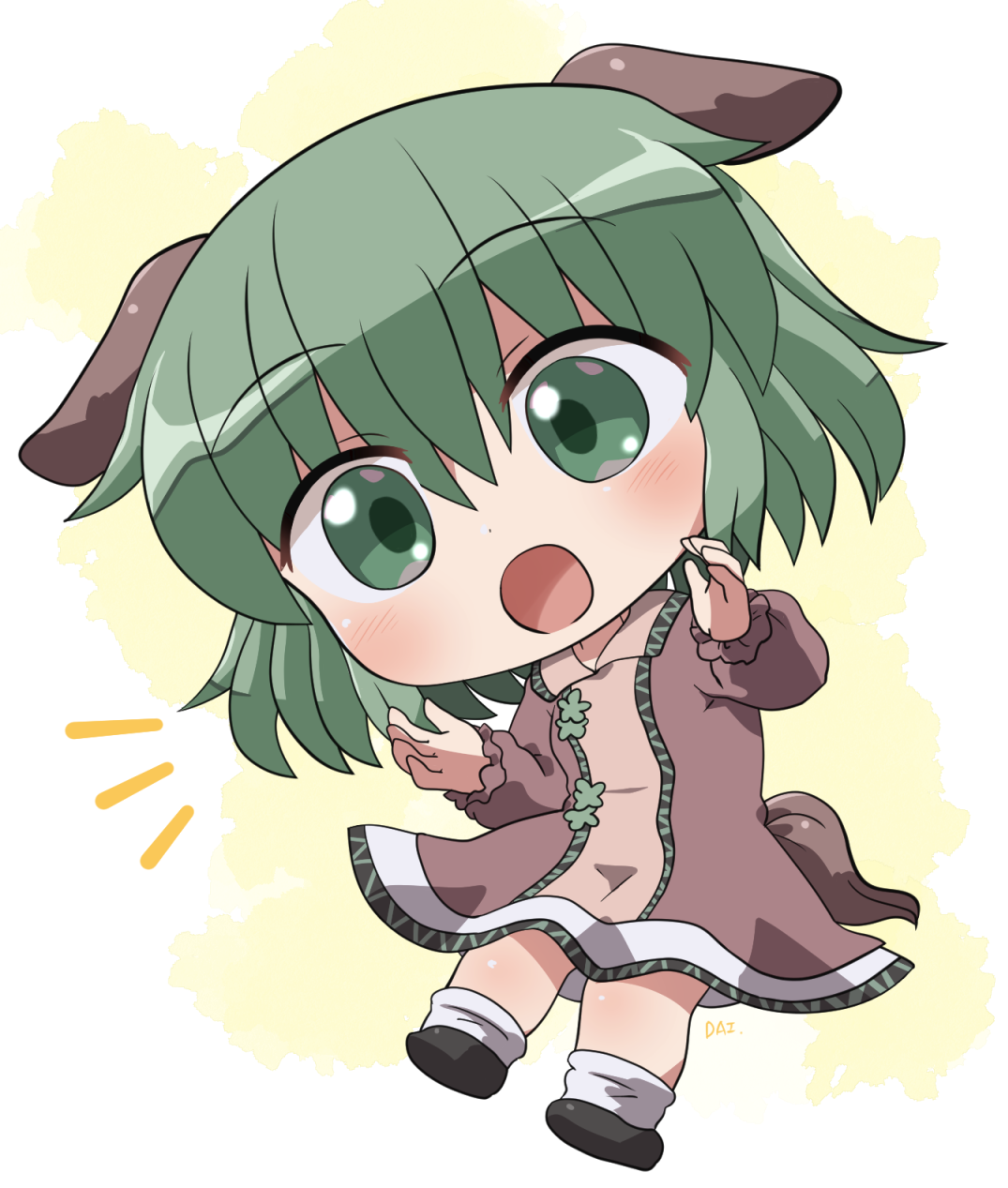 :o1girlanimal earsblack shoesblushbrown dresschibichibi onlydog earsdog girldog taildressfull bodygreen eyesgreen hairhair between eyeshands uplong sleeveslooking at viewernotice linesopen mouthshoesshort hairsignaturesockssolotailwhite socks