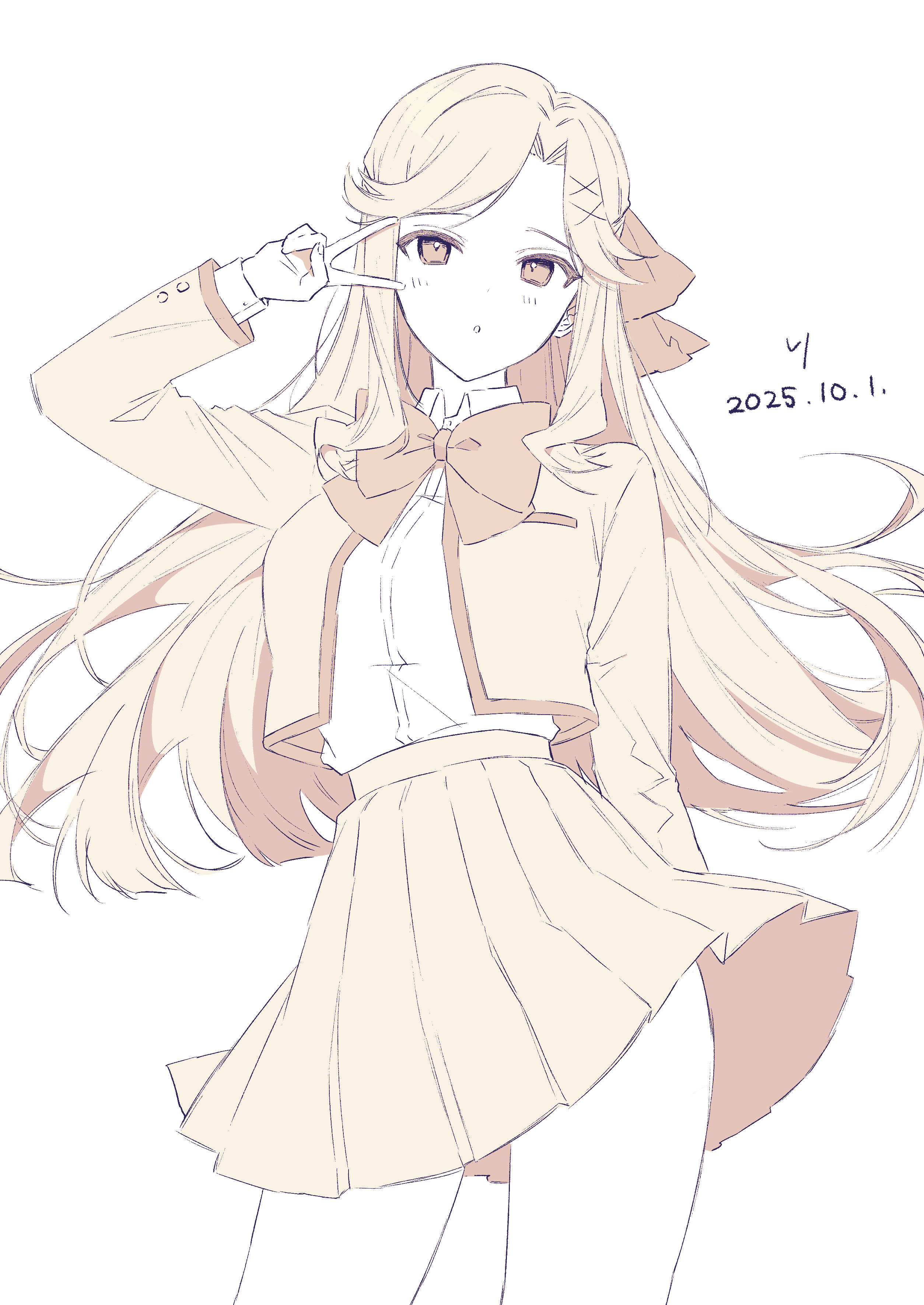 1girlarm behind backblushbowbowtiebrown themecollared shirtcontrappostocowboy shotdatedhair bowhair ornamenthand upjacketlong hairlong sleeveslooking at viewerminiskirtmonochromeopen clothesopen jacketparted bangsparted lipspleated skirtschool uniformseishou music academy uniformshirtshirt tucked insidelockssimple backgroundskirtsolostandingvv over eyewhite backgroundx hair ornament
