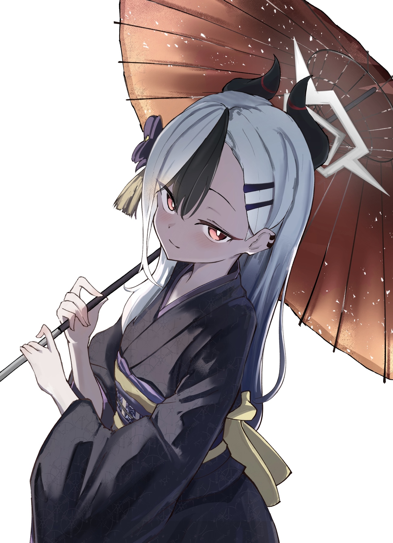 1girlblack hairblack hornsblack kimonoblushclosed mouthdemon hornsear piercinggrey hairhair ornamenthaircliphaloholdingholding umbrellahornsjapanese clotheskimonolong hairlong sleeveslooking at viewerobiofficial alternate costumeofficial alternate hairstyleoil-paper umbrellaorange eyespiercingsashsimple backgroundsingle sidelocksoloumbrellawhite backgroundwide sleeves