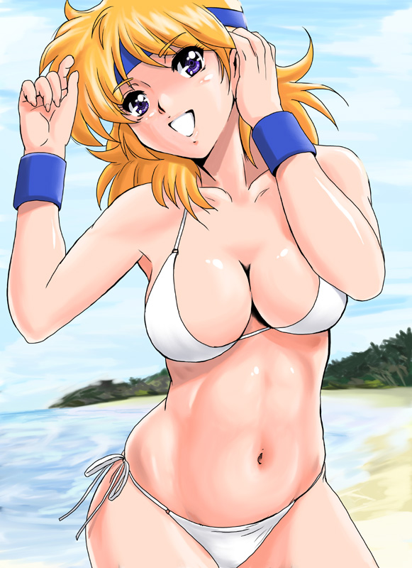 1girlbikiniblonde hairbreastscleavagedayfemale focusheadbandlarge breastsshiny skinside-tie bikini bottomsoloswimsuitwhite bikini