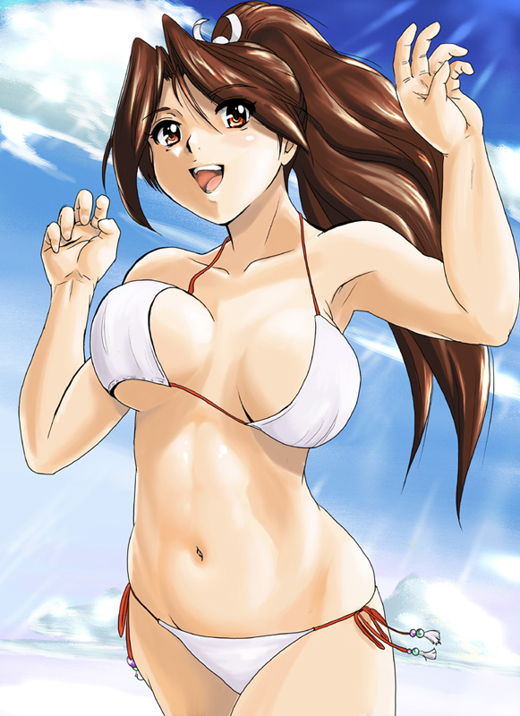 1girlbikinibouncing breastsbreastsdayfemale focuslarge breastslong hairponytailshiny skinside-tie bikini bottomsoloswimsuitunaligned breastswhite bikini
