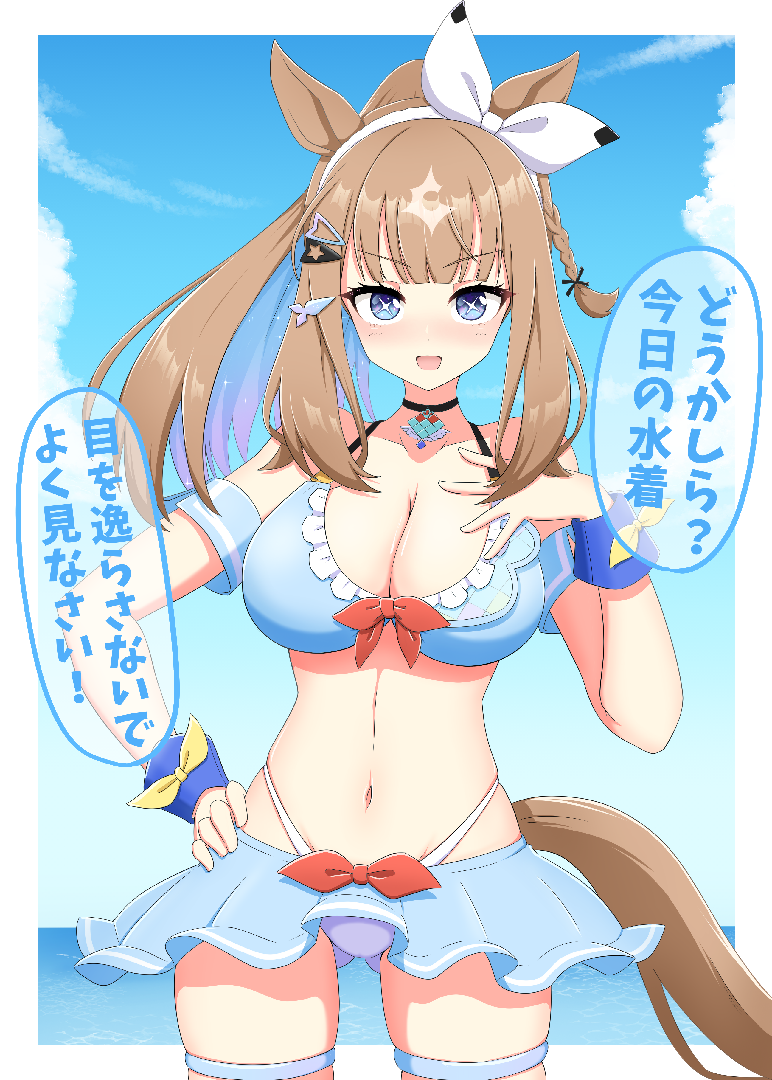 1girlalternate costumeanimal earsbikiniblue eyesblushbraidbreastscleavagecollarbonehair between eyeshair ornamenthairbandhorse earshorse girllarge breastslong hairlooking at viewernaveloceanopen mouthswimsuit