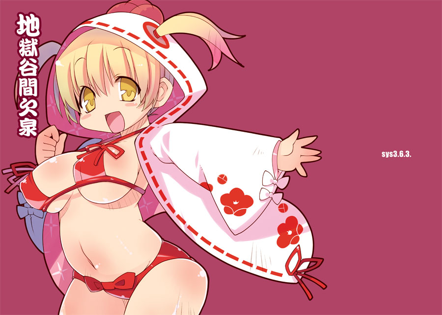 1girlbikiniblonde hairbreastscovered erect nipplesfemale focushoodlarge breastsred backgroundred bikinisimple backgroundsoloswimsuityellow eyes