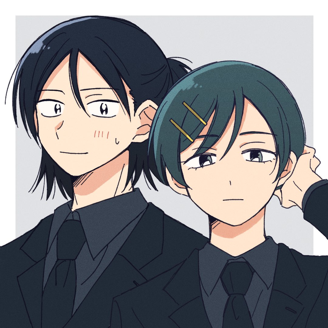 1boy1girlaqua hairblack eyesblack hairblack jacketblack necktieclosed mouthcollared shirtcousinsgrey backgroundgrey eyesgrey shirthair ornamenthairpinhand on own headjacketlapelslight smilenecktienotched lapelsofficial alternate costumeofficial alternate hairstylepixie cutponytailshirtshort hairshort ponytailsimple backgroundsmall sweatdropsuit jacketupper body