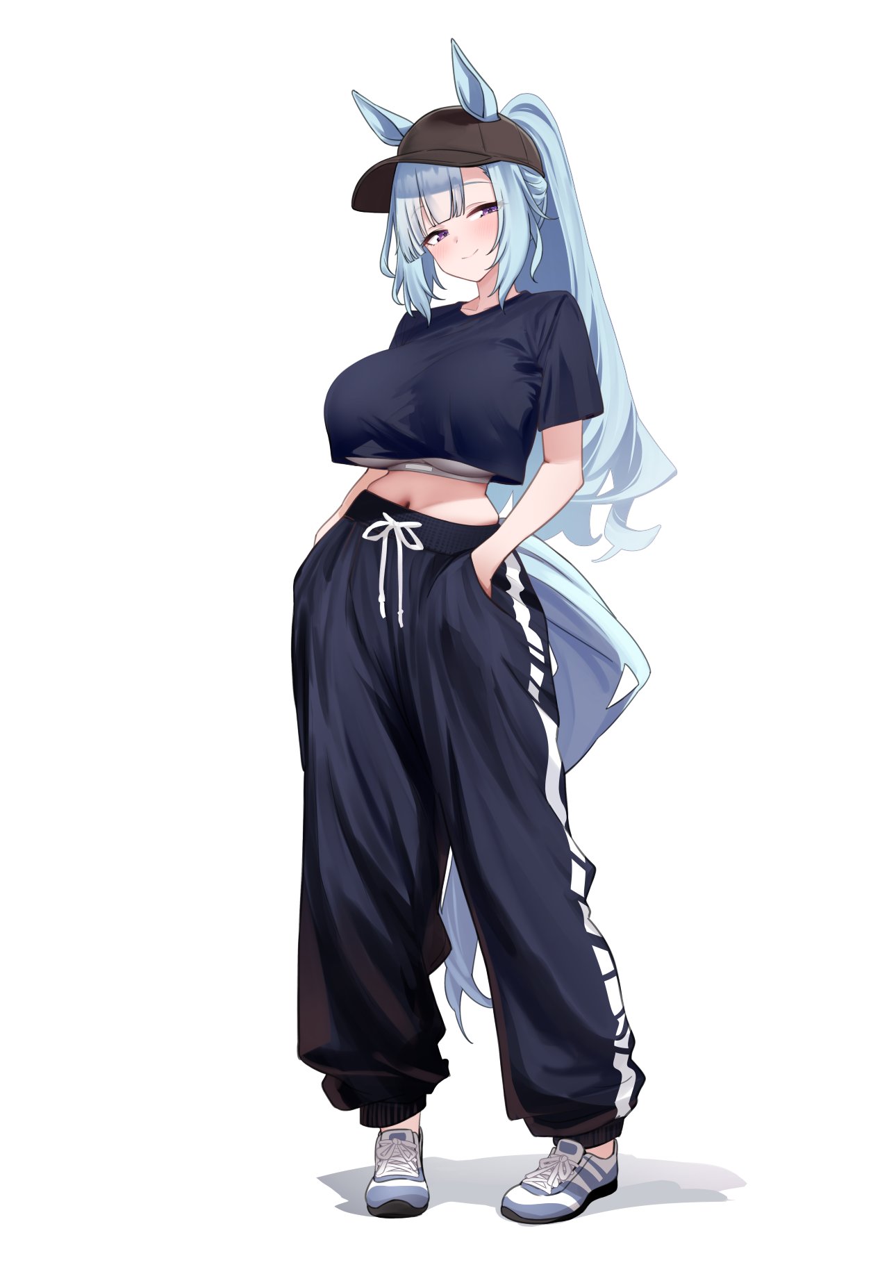 1girlalternate costumeanimal earsblack hatblack pantsblack shirtblue hairblue tailblushbreastsclosed mouthcrop topcrop top overhangears through headwearfull bodyhands in pocketshathorse earshorse girlhorse taillarge breastslong hairlooking at viewermidriffnavelpantsponytailpurple eyesshirtshoesshort sleevessimple backgroundsmilesolostandingstomachtailwhite background