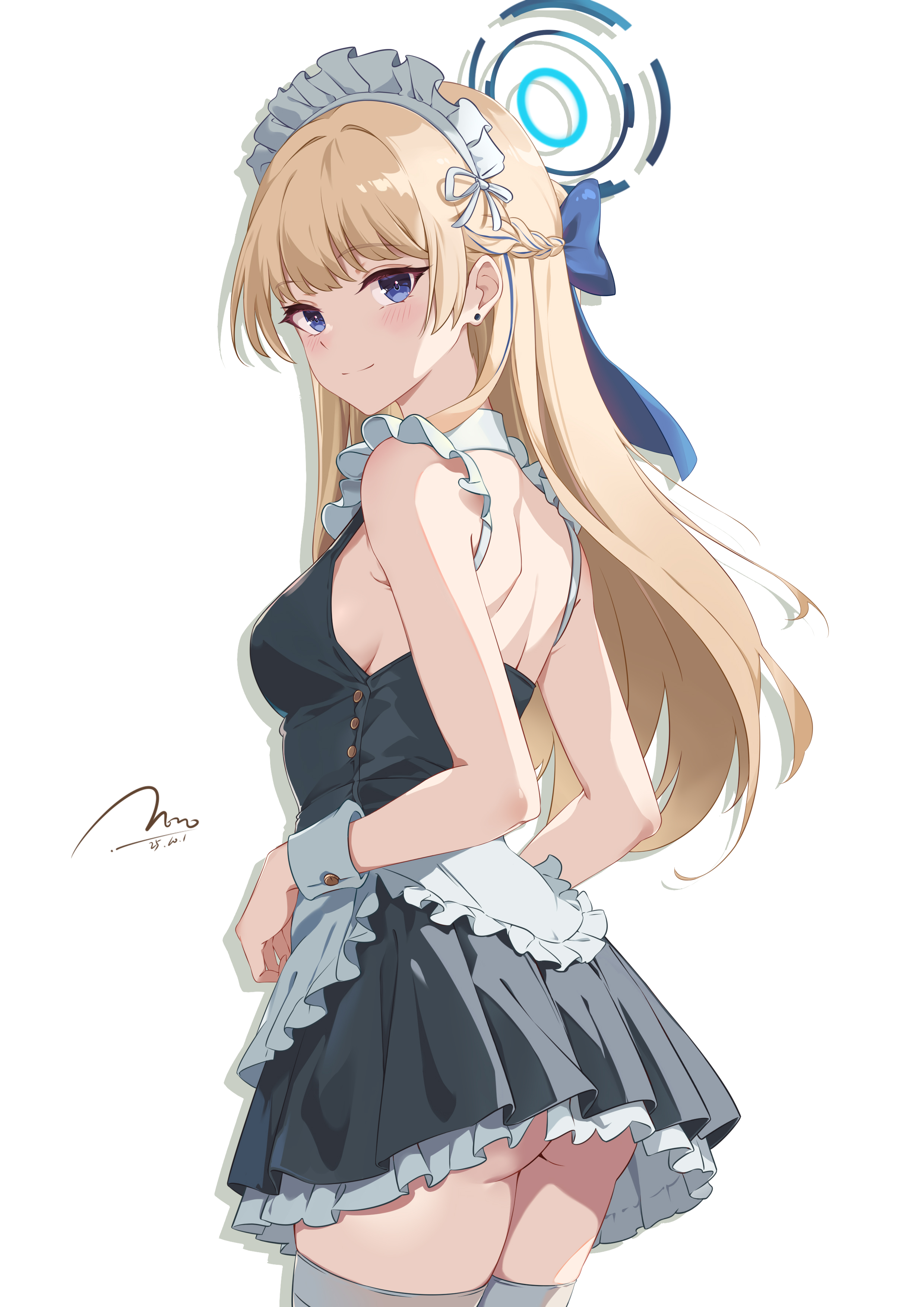 1girlapronassblack dressblonde hairblue bowblue eyesblue haloblue streaksblushbowbreastsclosed mouthdressearringsfrom sidehair bowhalojewelrylong hairlooking at viewermaidmaid headdressmedium breastsmulticolored hairsideboobsimple backgroundsolostandingstreaked hairstud earringsthighhighswhite apronwhite backgroundwhite thighhighswhite wrist cuffswrist cuffs