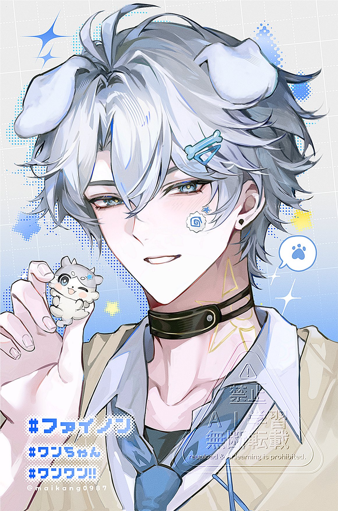 1boyanimal earsblack chokerblue eyesblue necktieblushchokercollarbonecollared shirtdog boydog earsgrey hairgrinhair between eyeskemonomimi modelooking at viewermale focusnecktieparted bangsportraitshirtshort hairsmilesolospoken paw printsweaterwatermarkwhite shirtwing collaryellow sweater