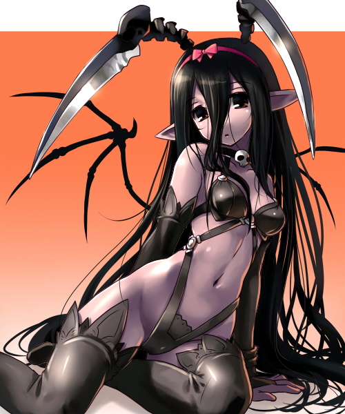 1girlanimal earsarm supportblack eyesblack hairblack themeblack thighhighsbrown eyeschokerelbow glovesfantasyfemale focusglovesgradient backgroundhair between eyeshairbandlong hairnavelpointy earsrabbit earsred backgroundsittingsolothighhighsvery long hairwingsyokozuwari