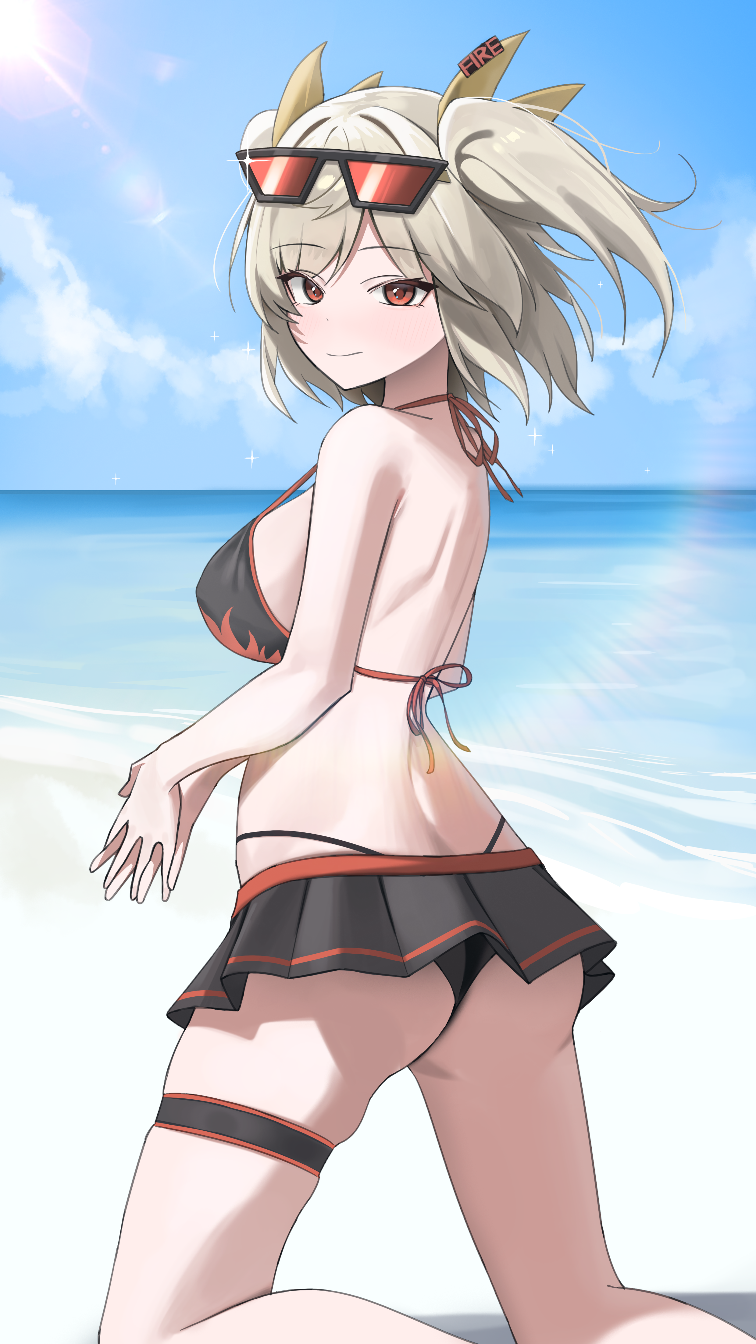 1girlassbare backbikinibikini skirtblack bikiniblonde hairbreastsclosed mouthcovered erect nippleseyewear on headfrom behindkneelinglarge breastslooking at viewerred eyesred-tinted eyewearsmilesoloswimsuitthigh straptinted eyeweartwo side up