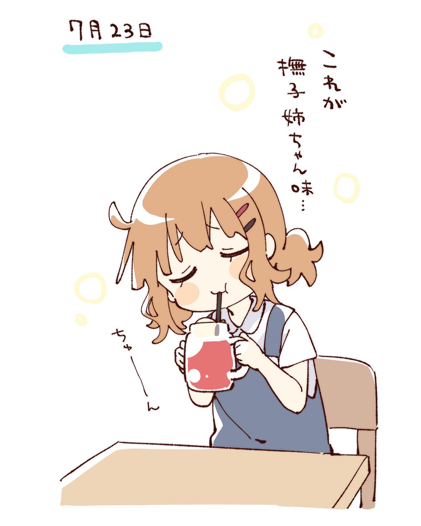 1girlblue vestblush stickersbrown hairclosed eyesclosed mouthcollared shirtcupdrinkingdrinking strawhair ornamenthairclipholdingholding cupparallel hairclipsshirtshort hairshort sleevessimple backgroundsoloupper bodyvestwhite backgroundwhite shirt