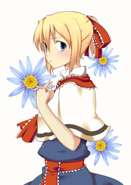 1girlalternate hairstyleblonde hairblue eyesfemale focusflowerplantponytailshort hairsolostandingwhite background